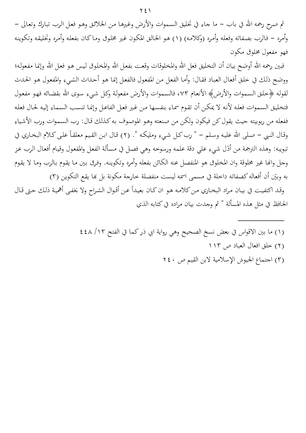 فبين رحمه الله أوضح بيان أن التخليق فعل الله والمخلوقات وقعت بفعل الله والمخلوق ليس هو فعل الله وإنما مفعوله؛ ووضح ذلك في خلق أفعال العباد فقال: وأما الفعل من المفعول فالفعل إنما هو أحداث الشيء والمفعول هو الحدث لقوله {خلق السموات والأرض} الأنعام 73، فالسموات والأرض مفعولة وكل شيء سوى الله بقضائه فهو مفعول فتخليق السموات فعله لأنه لا يمكن أن تقوم سماء بنفسها من غير فعل الفاعل وإنما تنسب السماء إليه لحال فعله ففعله من ربوبيته حيث يقول كن فيكون ولكن من صنعته وهو الموصوف به كذلك قال: رب السموات ورب الأشياء وقال النبي - صلى الله عليه وسلم - " رب كل شيء ومليكه ". (¬2) قال ابن القيم معلقاً على كلام البخاري في تبويبه: وهذه الترجمة من أدّل شيء علي دقة علمه ورسوخه وهي فصل في مسألة الفعل والمفعول وقيام أفعال الرب عز وجل وانها غير مخلوقة وان المخلوق هو المنفصل عنه الكائن بفعله وأمره وتكوينه. وفرق بين ما يقوم بالرب وما لا يقوم به وبيّن أن أفعاله كصفاته داخلة في مسمى اسمه ليست منفصلة خارجة مكونة بل بها يقع التكوين (¬3)