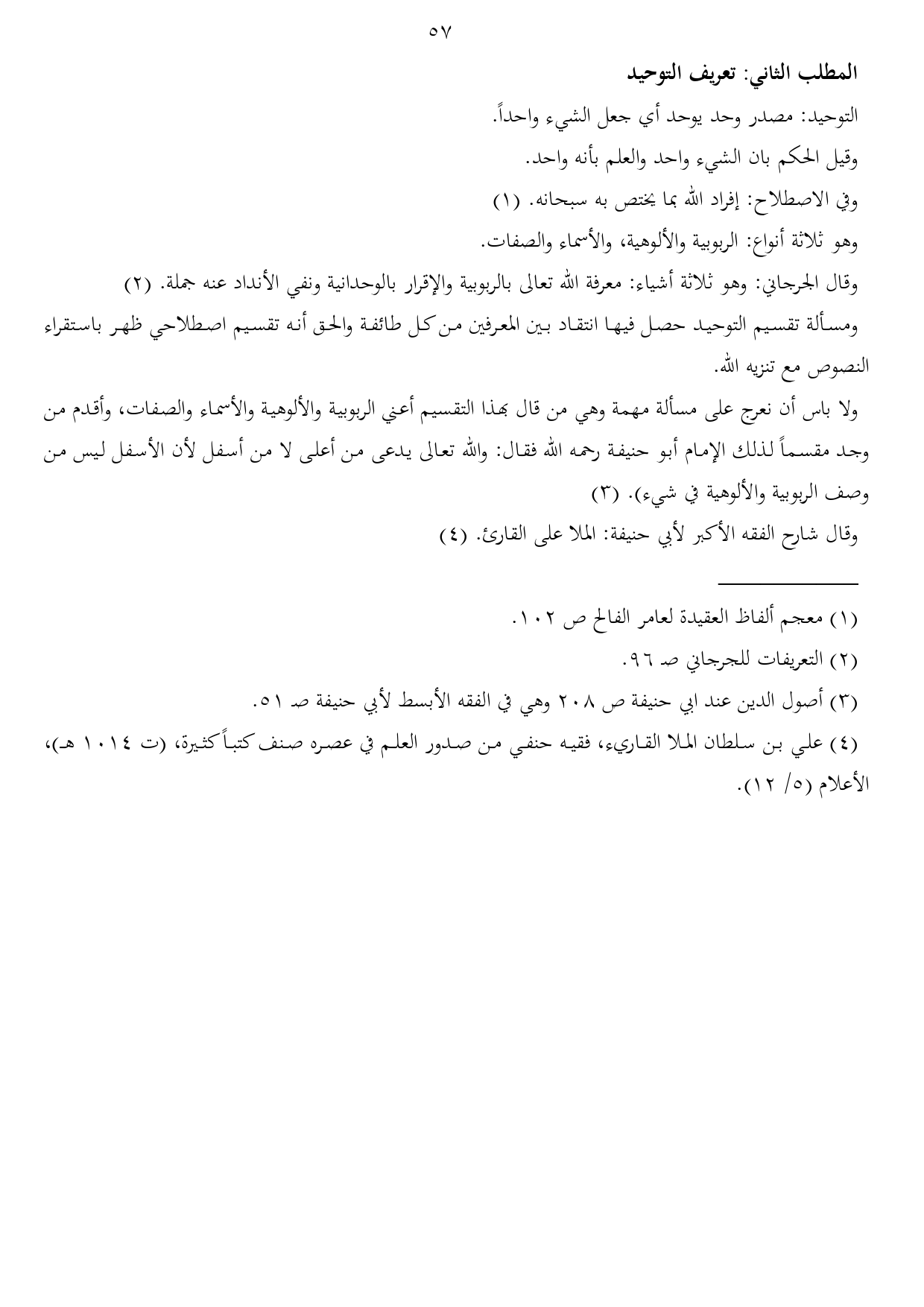 وقال الجرجاني: وهو ثلاثة أشياء: معرفة الله تعالى بالربوبية والإقرار بالوحدانية ونفي الأنداد عنه جملة. (¬2)