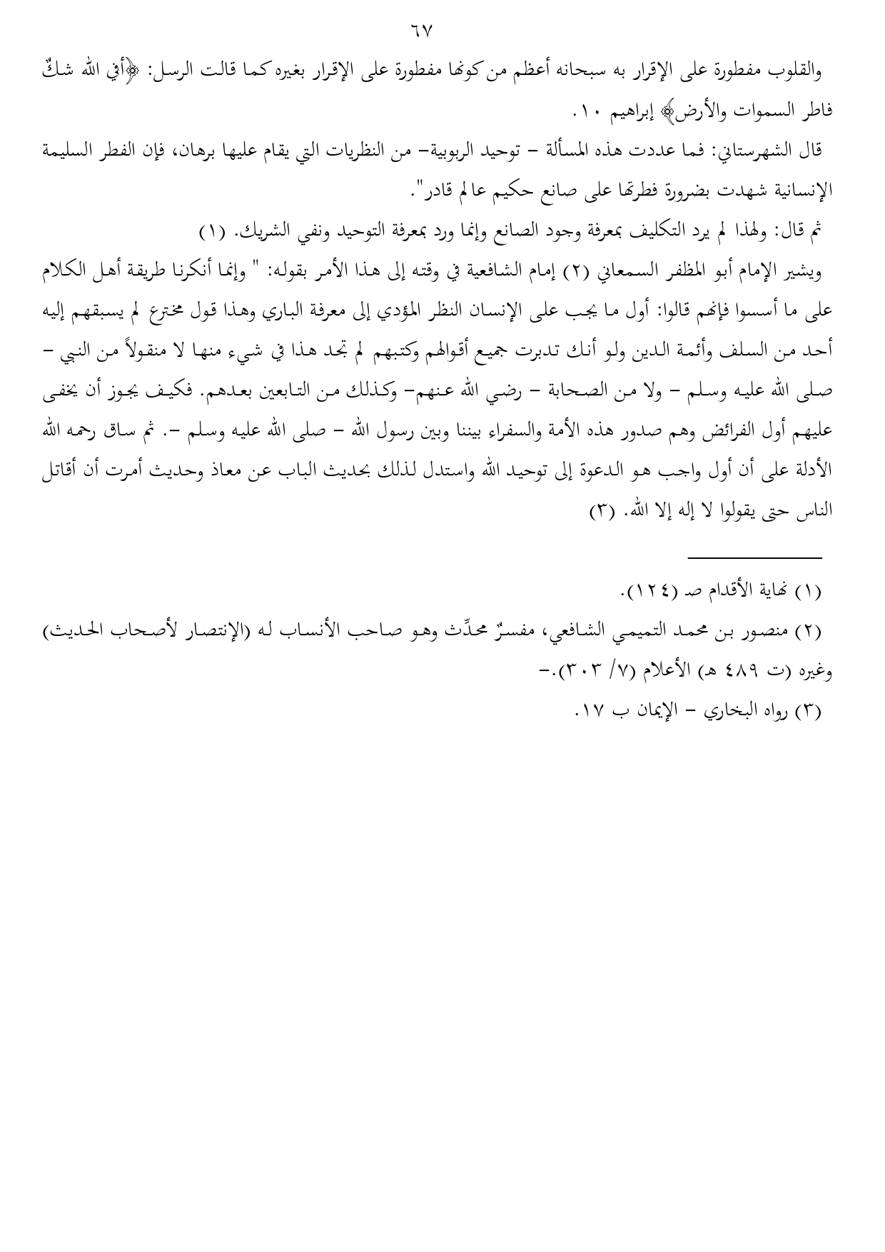 قال الشهرستاني: فما عددت هذه المسألة - توحيد الربوبية- من النظريات التي يقام عليها برهان، فإن الفطر السليمة الإنسانية شهدت بضرورة فطرتها على صانع حكيم عالم قادر".