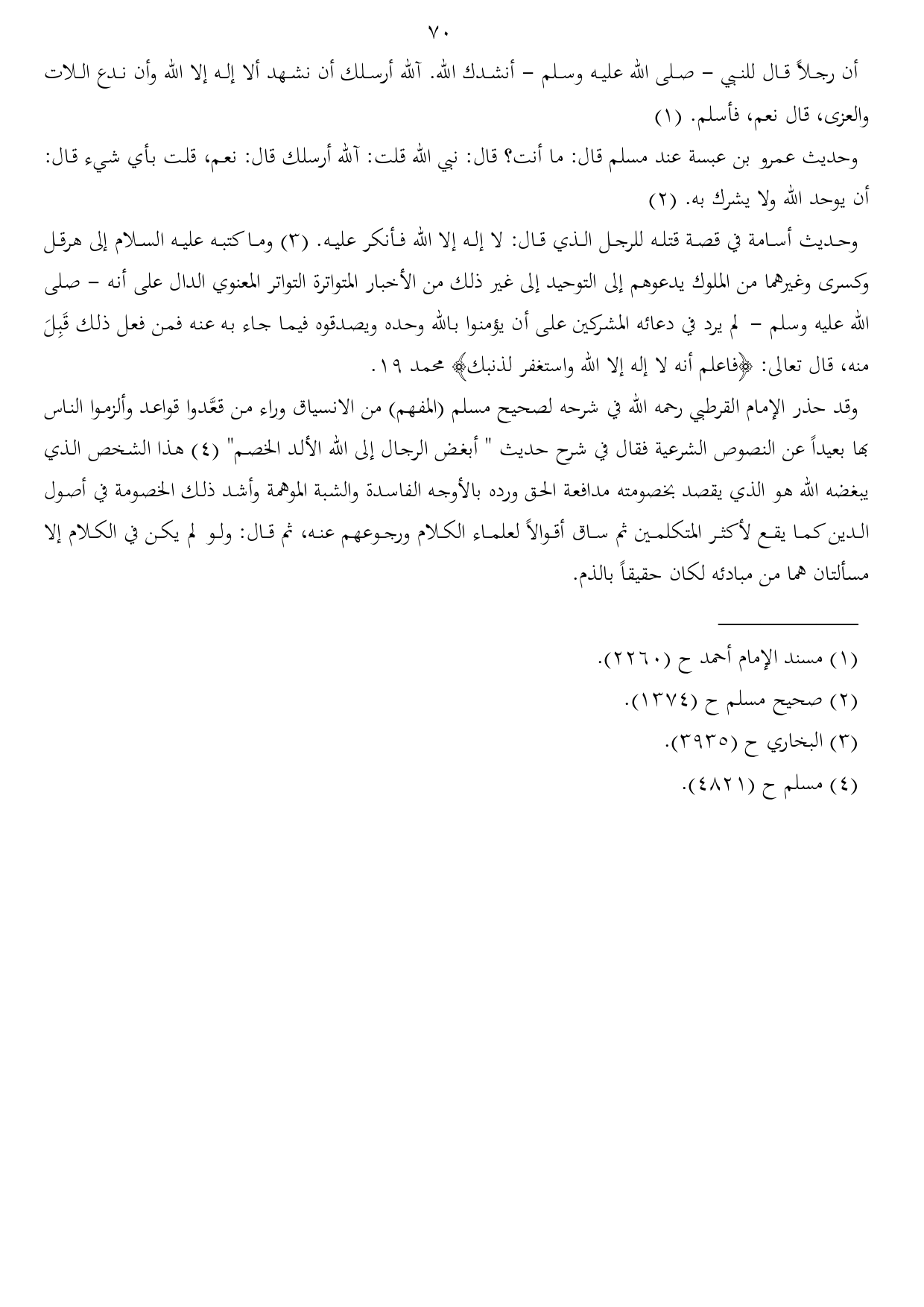 وقد حذر الإمام القرطبي رحمه الله في شرحه لصحيح مسلم (المفهم) من الانسياق وراء من قعَّدوا قواعد وألزموا الناس بها بعيداً عن النصوص الشرعية فقال في شرح حديث " أبغض الرجال إلى الله الألد الخصم" (¬4) هذا الشخص الذي يبغضه الله هو الذي يقصد بخصومته مدافعة الحق ورده بالأوجه الفاسدة والشبة الموهمة وأشد ذلك الخصومة في أصول الدين كما يقع لأكثر المتكلمين ثم ساق أقوالاً لعلماء الكلام ورجوعهم عنه، ثم قال: ولو لم يكن في الكلام إلا مسألتان هما من مبادئه لكان حقيقاً بالذم.