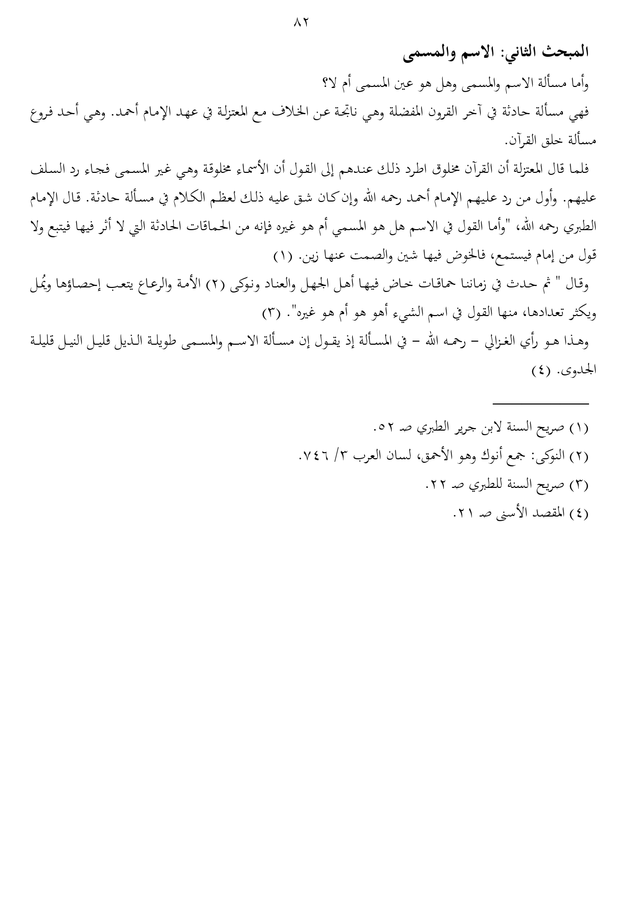 فلما قال المعتزلة أن القرآن مخلوق اطرد ذلك عندهم إلى القول أن الأسماء مخلوقة وهي غير المسمى فجاء رد السلف عليهم. وأول من رد عليهم الإمام أحمد رحمه الله وإن كان شق عليه ذلك لعظم الكلام في مسألة حادثة. قال الإمام الطبري رحمه الله، "وأما القول في الاسم هل هو المسمي أم هو غيره فإنه من الحماقات الحادثة التي لا أثر فيها فيتبع ولا قول من إمام فيستمع، فالخوض فيها شين والصمت عنها زين. (¬1)