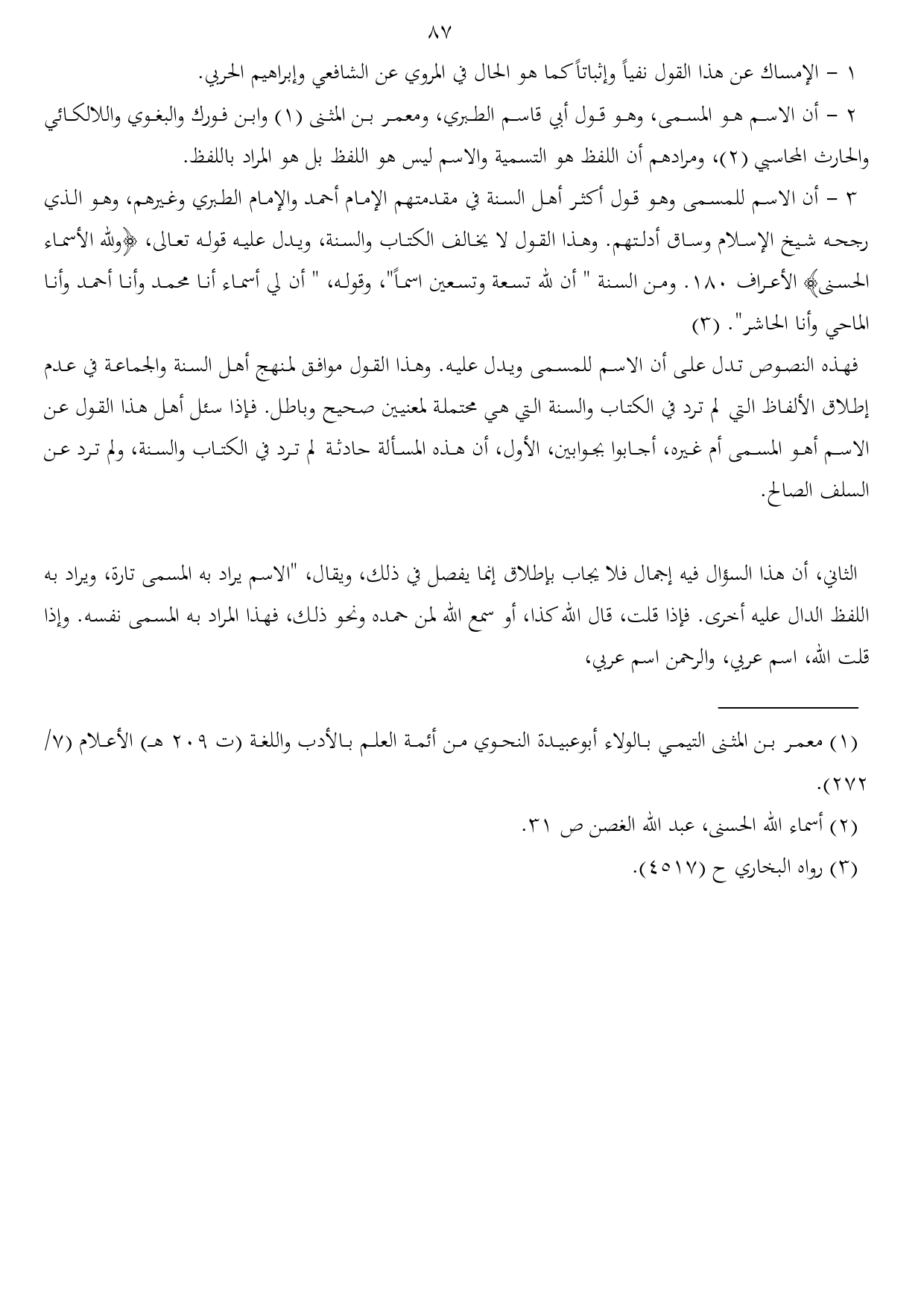الثاني، أن هذا السؤال فيه إجمال فلا يجاب بإطلاق إنما يفصل في ذلك، ويقال، "الاسم يراد به المسمى تارة، ويراد به اللفظ الدال عليه أخرى. فإذا قلت، قال الله كذا، أو سمع الله لمن حمده ونحو ذلك، فهذا المراد به المسمى نفسه. وإذا قلت الله، اسم عربي، والرحمن اسم عربي،