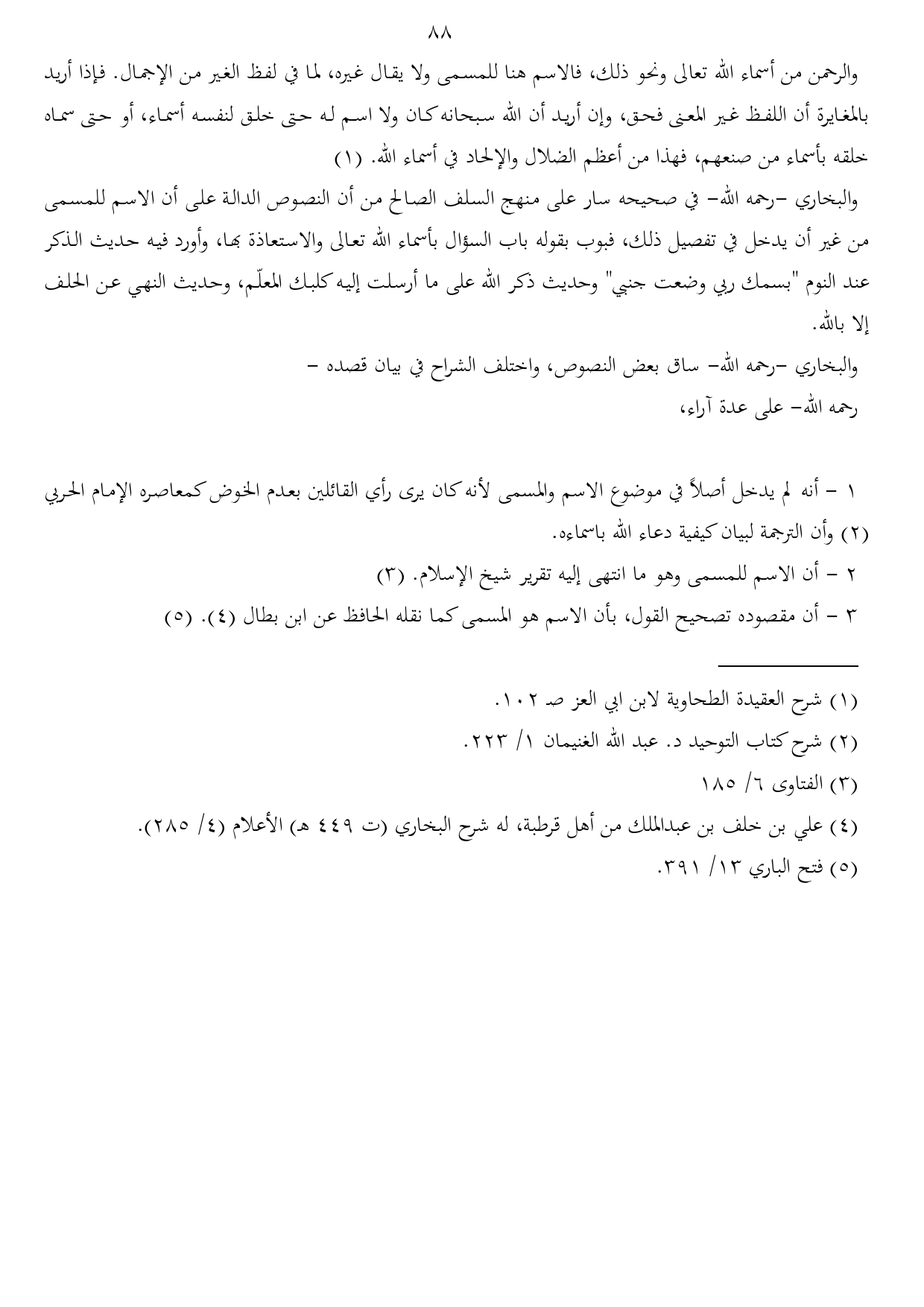 1 - أنه لم يدخل أصلاً في موضوع الاسم والمسمى لأنه كان يرى رأي القائلين بعدم الخوض كمعاصره الإمام الحربي (¬2) وأن الترجمة لبيان كيفية دعاء الله باسماءه.