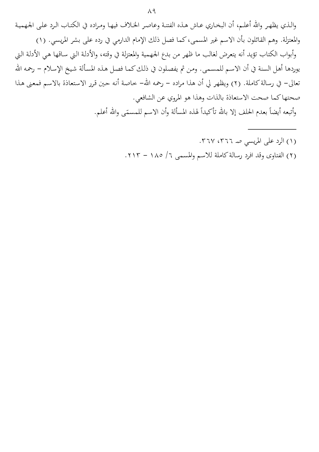 وأبواب الكتاب تؤيد أنه يتعرض لغالب ما ظهر من بدع الجهمية والمعتزلة في وقته، والأدلة التي ساقها هي الأدلة التي يوردها أهل السنة في أن الاسم للمسمى. ومن ثم يفصلون في ذلك كما فصل هذه المسألة شيخ الإسلام - رحمه الله تعالى- في رسالة كاملة. (¬2) ويظهر لي أن هذا مراده - رحمه الله- خاصة أنه حين قرر الاستعاذة بالاسم فمعنى هذا صحتها كما صحت الاستعاذة بالذات وهذا هو المروي عن الشافعي.