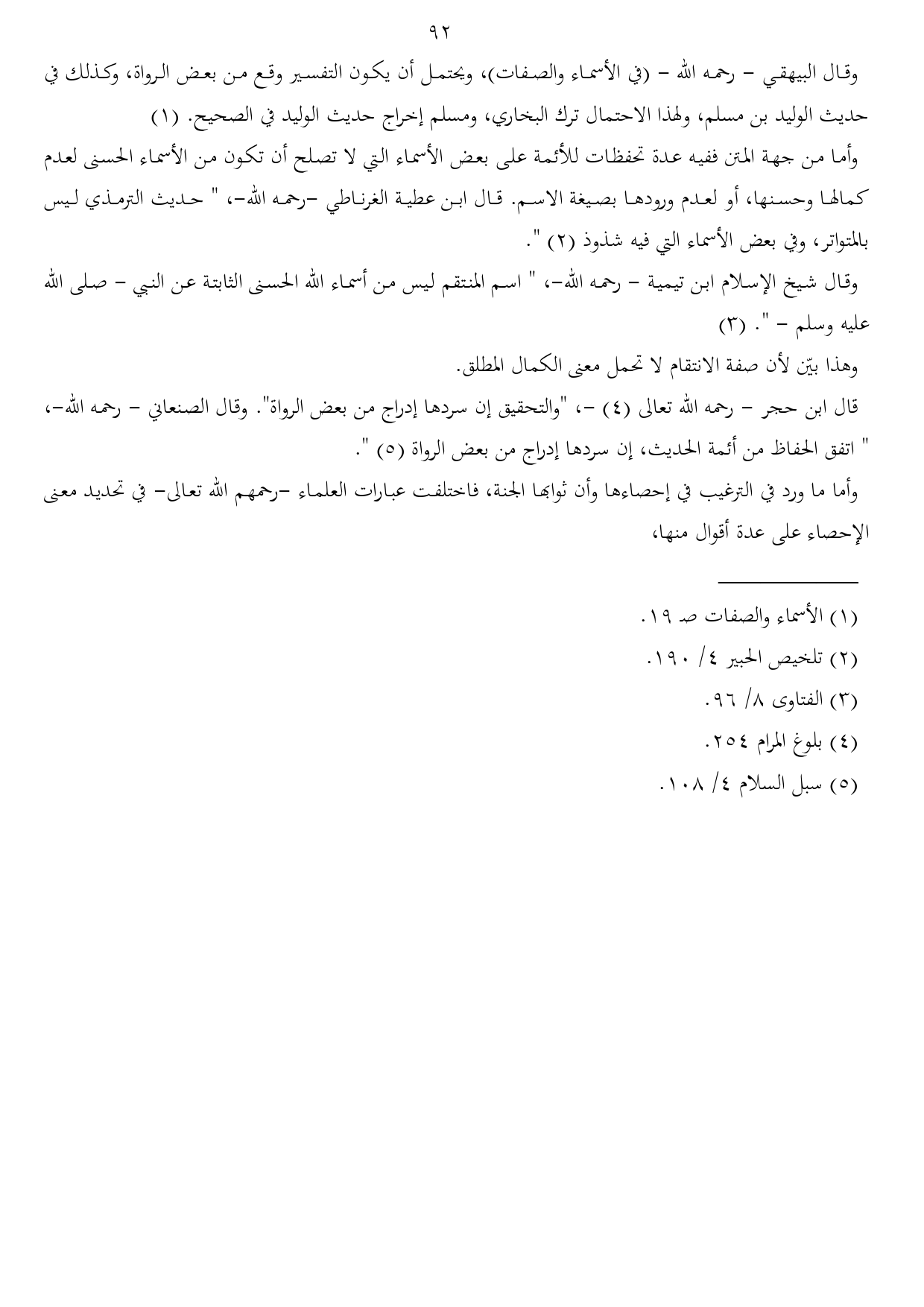 وقال شيخ الإسلام ابن تيمية - رحمه الله-، " اسم المنتقم ليس من أسماء الله الحسنى الثابتة عن النبي - صلى الله عليه وسلم - ". (¬3)
