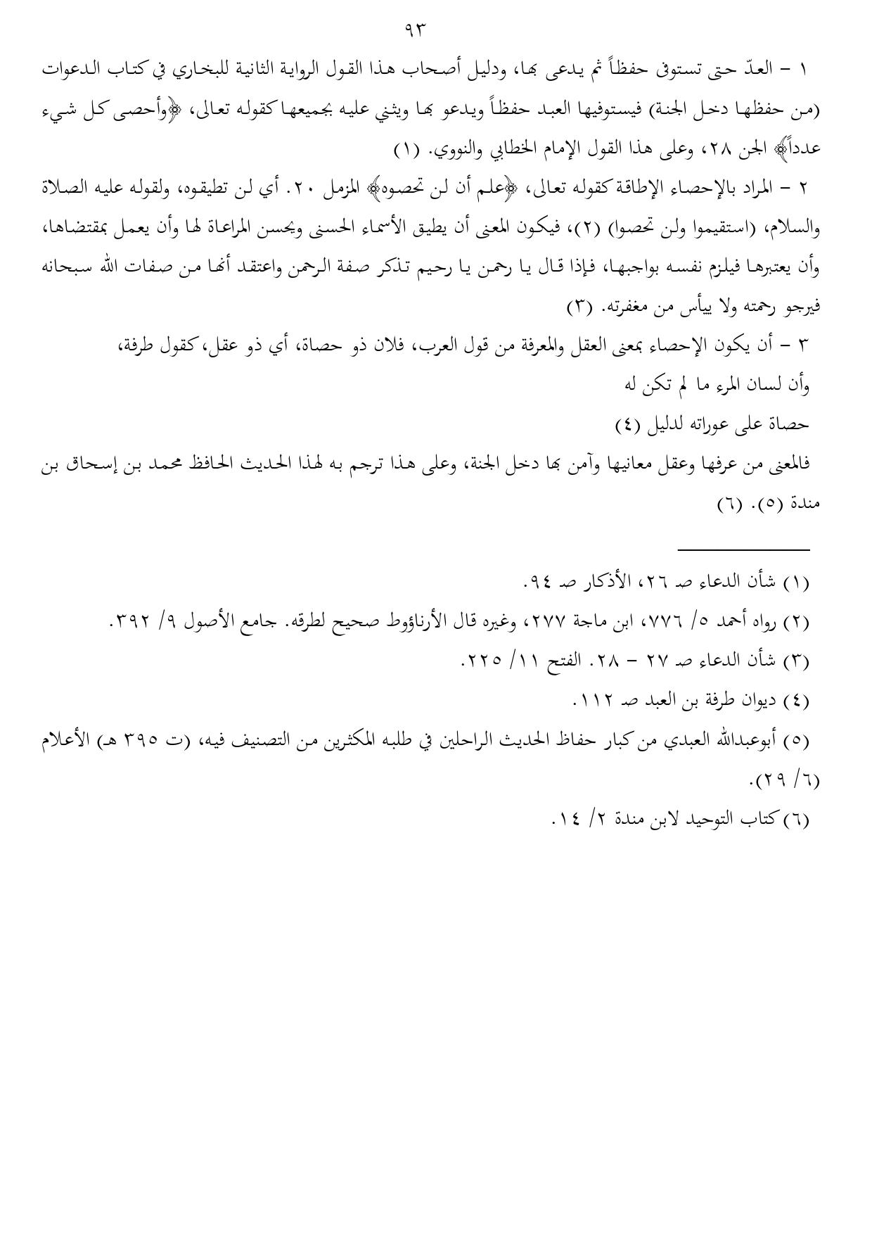 1 - العدّ حتى تستوفى حفظاً ثم يدعى بها، ودليل أصحاب هذا القول الرواية الثانية للبخاري في كتاب الدعوات (من حفظها دخل الجنة) فيستوفيها العبد حفظاً ويدعو بها ويثني عليه بجميعها كقوله تعالى، {وأحصى كل شيء عدداً} الجن 28، وعلى هذا القول الإمام الخطابي والنووي. (¬1)