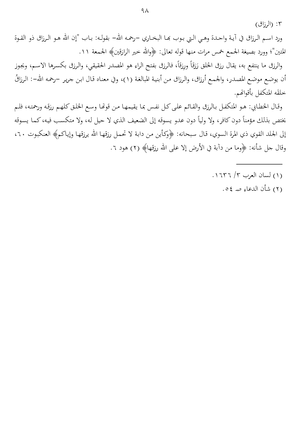 وقال الخطابي: هو المتكفل بالرزق والقائم على كل نفس بما يقيمها من قوتها وسع الخلق كلهم رزقه ورحمته، فلم يختص بذلك مؤمناً دون كافر، ولا ولياً دون عدو يسوقه إلى الضعيف الذي لا حيل له، ولا متكسب فيه، كما يسوقه إلى الجلد القوي ذي المرة السوي، قال سبحانه: {وكأين من دابة لا تحمل رزقها الله يرزقها وإياكم} العنكبوت 60، وقال جل شأنه: {وما من دآبة في الأرض إلا على الله رزقها} (¬2) هود 6.