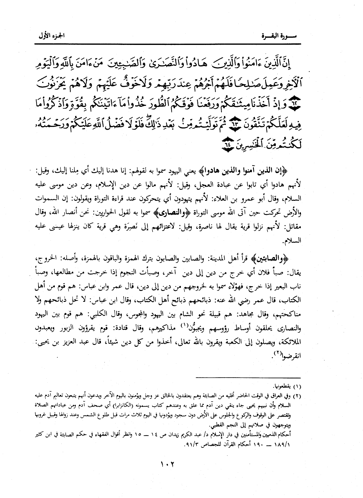 {وَالصَّابِئِينَ} قَرَأَ أَهْلُ الْمَدِينَةِ: وَالصَّابِينَ وَالصَّابُونَ بِتَرْكِ الْهَمْزَةِ وَالْبَاقُونَ بِالْهَمْزَةِ، وَأَصْلُهُ: الْخُرُوجُ، يُقَالُ: صَبَأَ فُلَانٌ أَيْ خَرَجَ مِنْ دِينٍ إِلَى دِينٍ آخَرَ، وَصَبَأَتِ النُّجُومُ إِذَا خَرَجَتْ مِنْ مَطَالِعِهَا، وَصَبَأَ نَابُ الْبَعِيرِ إِذَا خَرَجَ، فَهَؤُلَاءِ سُمُّوا بِهِ لِخُرُوجِهِمْ مِنْ دِينٍ إِلَى دِينٍ، قَالَ عُمَرُ وَابْنُ عَبَّاسٍ: هُمْ قَوْمٌ مِنْ أَهْلِ الْكِتَابِ، قَالَ عُمَرُ رَضِيَ اللَّهُ عَنْهُ: ذَبَائِحُهُمْ ذَبَائِحُ أَهْلِ الْكِتَابِ، وَقَالَ ابْنُ عَبَّاسٍ: لَا تَحِلُّ ذَبَائِحُهُمْ وَلَا مُنَاكَحَتُهُمْ، وَقَالَ مُجَاهِدٌ: هُمْ قَبِيلَةٌ نَحْوَ الشَّامِ بَيْنَ الْيَهُودِ وَالْمَجُوسِ، وَقَالَ الْكَلْبِيُّ: هُمْ قَوْمٌ بَيْنَ الْيَهُودِ وَالنَّصَارَى يَحْلِقُونَ أَوْسَاطَ رُءُوسِهِمْ وَيَجُبُّونَ (1) مَذَاكِيرَهُمْ، وَقَالَ قَتَادَةُ: قَوْمٌ يَقْرَءُونَ الزَّبُورَ وَيَعْبُدُونَ الْمَلَائِكَةَ، وَيُصَلُّونَ إِلَى الْكَعْبَةِ وَيُقِرُّونَ بِاللَّهِ تَعَالَى، أَخَذُوا مِنْ كُلِّ دِينٍ شَيْئًا، قَالَ عَبْدُ الْعَزِيزِ بْنُ يَحْيَى: انْقَرَضُوا (2) .
