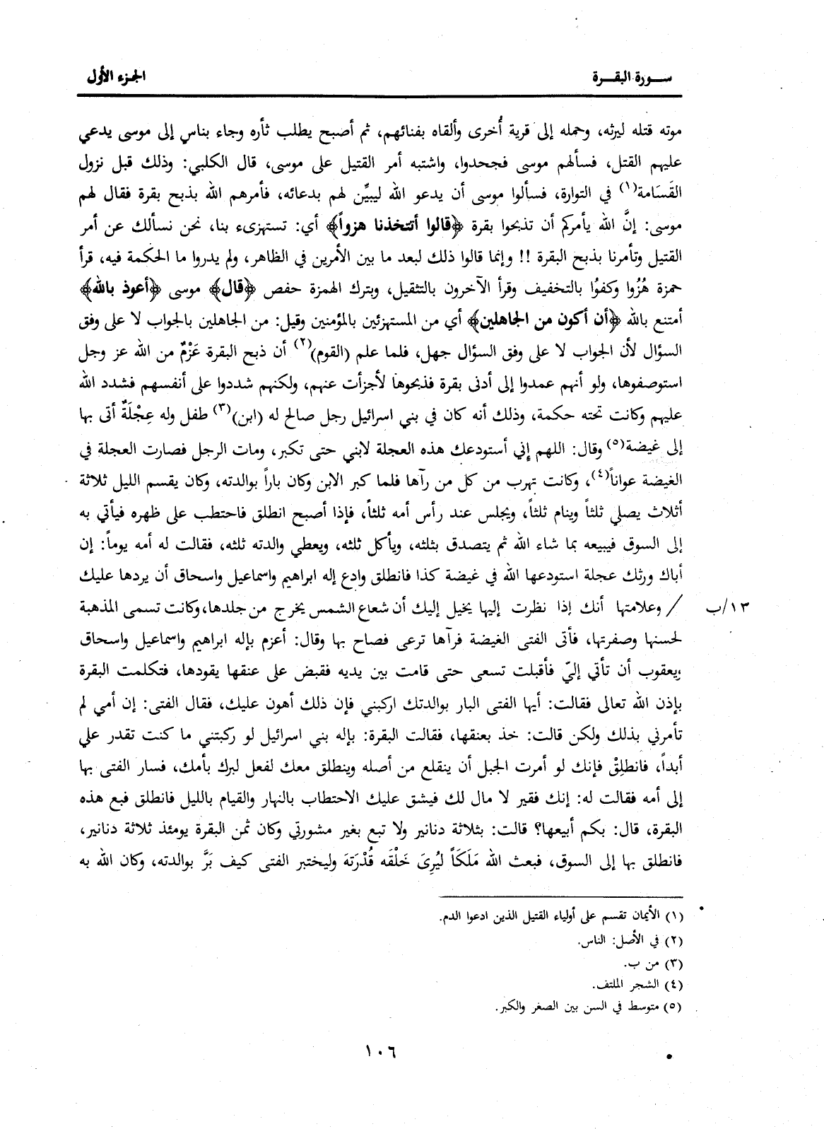 مَوْتُهُ قَتَلَهُ لِيَرِثَهُ، وَحَمَلَهُ إِلَى قَرْيَةٍ أُخْرَى وَأَلْقَاهُ بِفِنَائِهِمْ، ثُمَّ أَصْبَحَ يَطْلُبُ ثَأْرَهُ وَجَاءَ بِنَاسٍ إِلَى مُوسَى يَدَّعِي عَلَيْهِمُ الْقَتْلَ، فَسَأَلَهُمْ مُوسَى فَجَحَدُوا، وَاشْتَبَهَ أَمْرُ الْقَتِيلِ عَلَى مُوسَى، قَالَ الْكَلْبِيُّ: وَذَلِكَ قَبْلَ نُزُولِ الْقَسَامَةِ (1) فِي التَّوْرَاةِ، فَسَأَلُوا مُوسَى أَنْ يَدْعُوَ اللَّهَ لِيُبَيِّنَ لَهُمْ بِدُعَائِهِ، فَأَمَرَهُمُ اللَّهُ بِذَبْحِ بَقَرَةٍ فَقَالَ لَهُمْ مُوسَى: إِنَّ اللَّهَ يَأْمُرُكُمْ أَنْ تَذْبَحُوا بَقَرَةً {قَالُوا أَتَتَّخِذُنَا هُزُوًا} أَيْ: تَسْتَهْزِئُ بِنَا، نَحْنُ نَسْأَلُكَ عَنْ أَمْرِ الْقَتِيلِ وَتَأْمُرُنَا بِذَبْحِ الْبَقَرَةِ!! وَإِنَّمَا قَالُوا ذَلِكَ لِبُعْدِ مَا بَيْنَ الْأَمْرَيْنِ فِي الظَّاهِرِ، وَلَمْ يَدْرُوا مَا الْحِكْمَةُ فِيهِ، قَرَأَ حَمْزَةُ هُزُوًا وَكُفُوًا بِالتَّخْفِيفِ وَقَرَأَ الْآخَرُونَ بِالتَّثْقِيلِ، وَبِتَرْكِ الْهَمْزَةِ حَفْصٌ {قَالَ} مُوسَى {أَعُوَذُ بِاللَّهِ} أَمْتَنِعُ بِاللَّهِ {أَنْ أَكُونَ مِنَ الْجَاهِلِينَ} أَيْ مِنَ الْمُسْتَهْزِئِينَ بِالْمُؤْمِنِينَ وَقِيلَ: مِنَ الْجَاهِلِينَ بِالْجَوَابِ لَا عَلَى وَفْقِ السُّؤَالِ لِأَنَّ الْجَوَابَ لَا عَلَى وَفْقِ السُّؤَالِ جَهْلٌ، فَلَمَّا عَلِمَ (الْقَوْمُ) (2) أَنَّ ذَبْحَ الْبَقَرَةِ عَزْمٌ مِنَ اللَّهِ عَزَّ وَجَلَّ اسْتَوْصَفُوهَا، وَلَوْ أَنَّهُمْ عَمَدُوا إِلَى أَدْنَى بَقَرَةٍ فَذَبَحُوهَا لَأَجْزَأَتْ عَنْهُمْ، وَلَكِنَّهُمْ شَدَّدُوا عَلَى أَنْفُسِهِمْ فَشَدَّدَ اللَّهُ عَلَيْهِمْ وَكَانَتْ تَحْتَهُ حِكْمَةٌ، وَذَلِكَ أَنَّهُ كَانَ فِي بَنِي إِسْرَائِيلَ رَجُلٌ صَالِحٌ لَهُ (ابْنٌ) (3) طِفْلٌ وَلَهُ عِجْلَةٌ أَتَى بِهَا إِلَى غَيْضَةٍ (4) وَقَالَ: اللَّهُمَّ إِنِّي أَسْتَوْدِعُكَ هَذِهِ الْعِجْلَةَ لِابْنِي حَتَّى تَكْبُرَ، وَمَاتَ الرَّجُلُ فَصَارَتِ الْعِجْلَةُ فِي الْغَيْضَةِ عَوَانًا (5) ، وَكَانَتْ تَهْرُبُ مِنْ كُلِّ مَنْ رَآهَا فَلَمَّا كَبُرَ الِابْنُ وَكَانَ بَارًّا بِوَالِدَتِهِ، وَكَانَ يُقَسِّمُ اللَّيْلَ ثَلَاثَةَ أَثْلَاثٍ يُصَلِّي ثُلْثًا وَيَنَامُ ثُلْثًا وَيَجْلِسُ عِنْدَ رَأْسِ أُمِّهِ ثُلْثًا، فَإِذَا أَصْبَحَ انْطَلَقَ فَاحْتَطَبَ عَلَى ظَهْرِهِ فَيَأْتِي بِهِ إِلَى السُّوقِ فَيَبِيعُهُ بِمَا شَاءَ اللَّهُ ثُمَّ يَتَصَدَّقُ بِثُلْثِهِ، وَيَأْكُلُ ثُلْثَهُ، وَيُعْطِي وَالِدَتَهُ ثُلْثَهُ، فَقَالَتْ لَهُ أُمُّهُ يَوْمًا: إِنَّ أَبَاكَ وَرَّثَكَ عِجْلَةً اسْتَوْدَعَهَا اللَّهَ فِي غَيْضَةِ كَذَا فَانْطَلِقْ وَادْعُ إِلَهَ إِبْرَاهِيمَ وَإِسْمَاعِيلَ وَإِسْحَاقَ أَنْ يردها عليك 13/ب وَعَلَامَتُهَا أَنَّكَ إِذَا نَظَرْتَ إِلَيْهَا يُخَيَّلُ إِلَيْكَ أَنَّ شُعَاعَ الشَّمْسِ يَخْرُجُ مِنْ جِلْدِهَا، وَكَانَتْ تُسَمَّى الْمُذَهَّبَةَ لِحُسْنِهَا وَصُفْرَتِهَا، فَأَتَى الْفَتَى الْغَيْضَةَ فَرَآهَا تَرْعَى فَصَاحَ بِهَا وَقَالَ: أَعْزِمُ بِإِلَهِ إِبْرَاهِيمَ وَإِسْمَاعِيلَ وَإِسْحَاقَ وَيَعْقُوبَ أَنْ تَأْتِيَ إِلَيَّ فَأَقْبَلَتْ تَسْعَى حَتَّى قَامَتْ بَيْنَ يَدَيْهِ فَقَبَضَ عَلَى عُنُقِهَا يَقُودُهَا، فَتَكَلَّمَتِ الْبَقَرَةُ بِإِذْنِ اللَّهِ تَعَالَى فَقَالَتْ: أَيُّهَا الْفَتَى الْبَارُّ بِوَالِدَتِكَ ارْكَبْنِي فَإِنَّ ذَلِكَ أَهْوَنُ عَلَيْكَ، فَقَالَ الْفَتَى: إِنَّ أُمِّي لَمْ تَأْمُرْنِي بِذَلِكَ وَلَكِنْ قَالَتْ: خُذْ بِعُنُقِهَا، فَقَالَتِ الْبَقَرَةُ: بِإِلَهِ بَنِي إِسْرَائِيلَ لَوْ رَكِبْتَنِي مَا كُنْتَ تَقْدِرُ عَلَيَّ أَبَدًا، فَانْطَلِقْ فَإِنَّكَ لَوْ أَمَرْتَ الْجَبَلَ أَنْ يَنْقَلِعَ مِنْ أَص