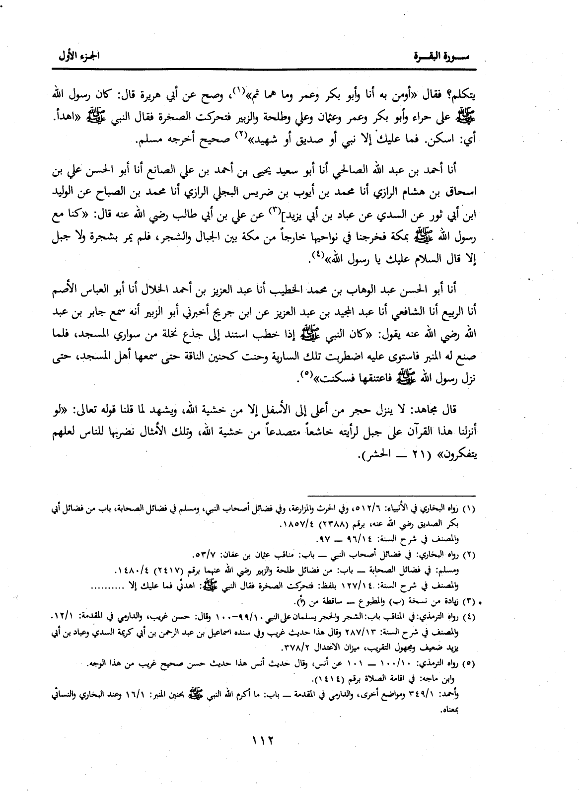 يَتَكَلَّمُ؟ فَقَالَ "أُومِنُ بِهِ أَنَا وَأَبُو بَكْرٍ وَعُمَرُ وَمَا هُمَا ثَمَّ" (1) ، وَصَحَّ عَنْ أَبِي هُرَيْرَةَ قَالَ: كَانَ رَسُولُ اللَّهِ صَلَّى اللَّهُ عَلَيْهِ وَسَلَّمَ عَلَى حِرَاءٍ وَأَبُو بَكْرٍ وَعُمَرُ وَعُثْمَانُ وَعَلِيٌّ وَطَلْحَةُ وَالزُّبَيْرُ فَتَحَرَّكَتِ الصَّخْرَةُ فَقَالَ النَّبِيُّ صَلَّى اللَّهُ عَلَيْهِ وَسَلَّمَ "اهْدَأْ أَيِ: اسْكُنْ. فَمَا عَلَيْكَ إِلَّا نَبِيٌّ أَوْ صَدِّيقٌ أَوْ شَهِيدٌ" (2) صَحِيحٌ أَخْرَجَهُ مُسْلِمٌ.
