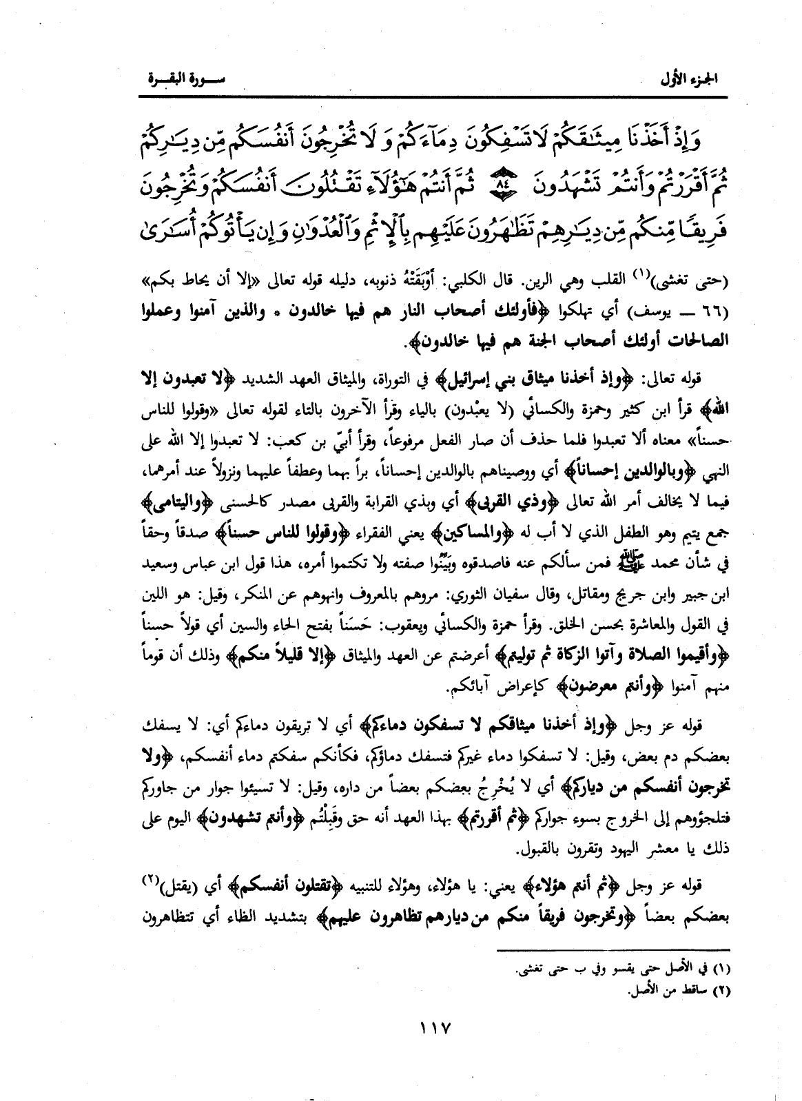 قَوْلُهُ عَزَّ وَجَلَّ {وَإِذْ أَخَذْنَا مِيثَاقَكُمْ لَا تَسْفِكُونَ دِمَاءَكُمْ} أَيْ لَا تُرِيقُونَ دِمَاءَكُمْ أَيْ: لَا يَسْفِكُ بَعْضُكُمْ دَمَ بَعْضٍ، وَقِيلَ: لَا تَسْفِكُوا دِمَاءَ غَيْرِكُمْ فَتَسْفِكُ دِمَاءَكُمْ، فَكَأَنَّكُمْ سَفَكْتُمْ دِمَاءَ أَنْفُسِكُمْ، {وَلَا تُخْرِجُونَ أَنْفُسَكُمْ مِنْ دِيَارِكُمْ} أَيْ لَا يُخْرِجُ بَعْضُكُمْ بَعْضًا مِنْ دَارِهِ، وَقِيلَ: لَا تُسِيئُوا جِوَارَ من جاوركم فتلجؤوهم إِلَى الْخُرُوجِ بِسُوءِ جِوَارِكُمْ {ثُمَّ أَقْرَرْتُمْ} بِهَذَا الْعَهْدِ أَنَّهُ حَقٌّ وَقَبِلْتُمْ {وَأَنْتُمْ تَشْهَدُونَ} الْيَوْمَ عَلَى ذَلِكَ يَا مَعْشَرَ الْيَهُودِ وَتُقِرُّونَ بِالْقَبُولِ.