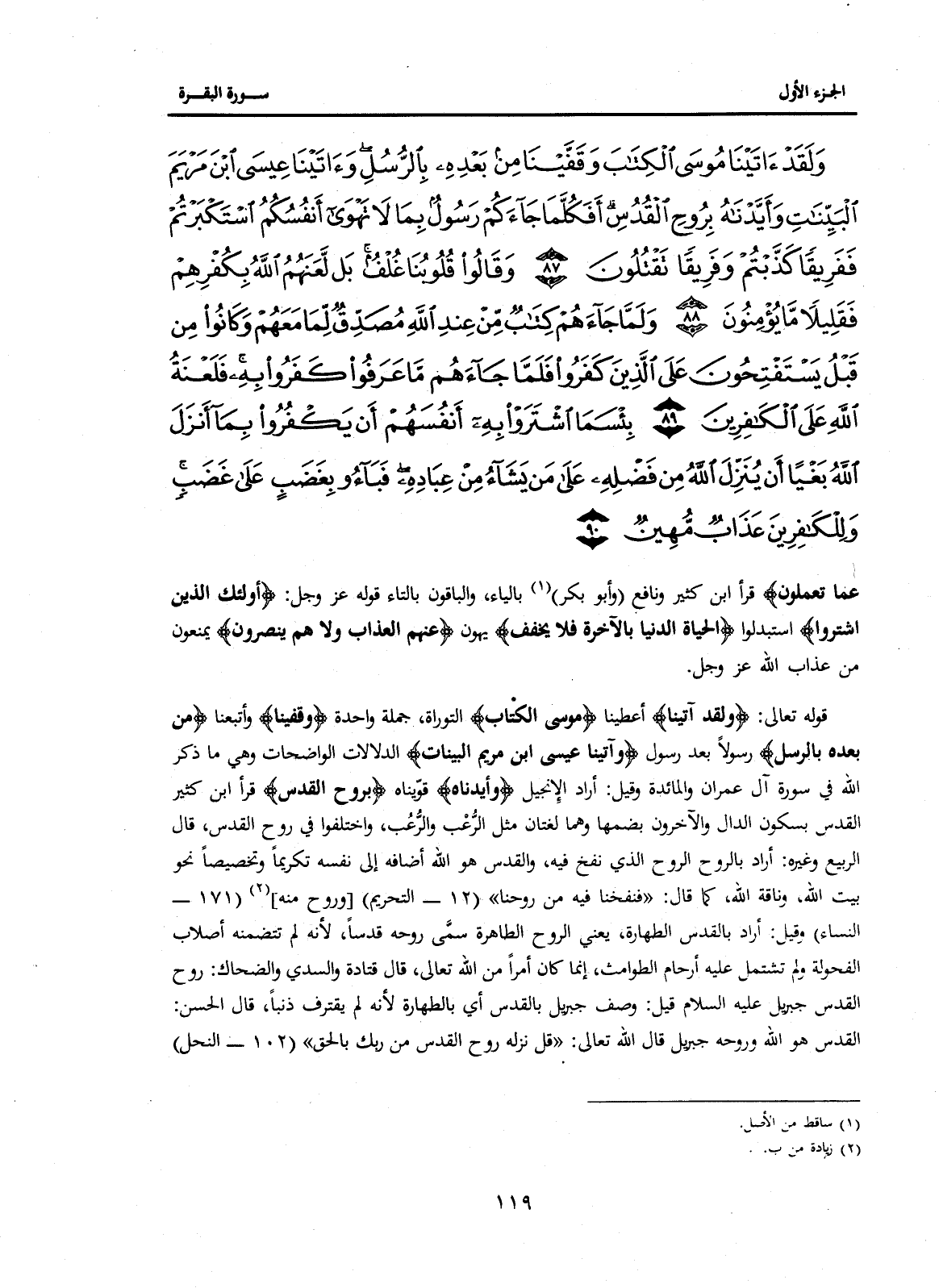 {وَلَقَدْ آتَيْنَا} أَعْطَيْنَا {مُوسَى الْكِتَابَ} التَّوْرَاةَ، جُمْلَةً وَاحِدَةً {وَقَفَّيْنَا} وَأَتْبَعْنَا {مِنْ بَعْدِهِ بِالرُّسُلِ} رَسُولًا بَعْدَ رَسُولٍ {وَآتَيْنَا عِيسَى ابْنَ مَرْيَمَ الْبَيِّنَاتِ} الدَّلَالَاتِ الْوَاضِحَاتِ وَهِيَ مَا ذَكَرَ اللَّهُ فِي سُورَةِ آلِ عِمْرَانَ وَالْمَائِدَةِ وَقِيلَ: أَرَادَ الْإِنْجِيلَ {وَأَيَّدْنَاهُ} قَوَّيْنَاهُ {بِرُوحِ الْقُدُسِ} قَرَأَ ابْنُ كَثِيرٍ الْقُدْسِ بِسُكُونِ الدَّالِ وَالْآخَرُونَ بِضَمِّهَا وَهُمَا لُغَتَانِ مِثْلَ الرُّعُبِ وَالرُّعْبِ، وَاخْتَلَفُوا فِي رُوحِ الْقُدُسِ، قَالَ الرَّبِيعُ وَغَيْرُهُ: أَرَادَ بِالرُّوحِ الَّذِي نُفِخَ فِيهِ، وَالْقُدُسُ هُوَ اللَّهُ أَضَافَهُ إِلَى نَفْسِهِ تَكْرِيمًا وَتَخْصِيصًا نَحْوَ بَيْتِ اللَّهِ، وَنَاقَةِ اللَّهِ، كَمَا قَالَ: "فَنَفَخْنَا فِيهِ مِنْ رُوحِنَا" (12-التَّحْرِيمِ) [وَرُوحٌ مِنْهُ] (1) (171-النِّسَاءِ) وَقِيلَ: أَرَادَ بِالْقُدُسِ الطِّهَارَةَ، يَعْنِي الرُّوحَ الطَّاهِرَةَ سَمَّى رُوحَهُ قُدُسًا، لِأَنَّهُ لَمْ تَتَضَمَّنْهُ أَصْلَابُ الْفُحُولَةِ وَلَمْ تَشْتَمِلْ عَلَيْهِ أَرْحَامُ الطَّوَامِثِ، إِنَّمَا كَانَ أَمْرًا مِنْ أَمْرِ اللَّهِ تَعَالَى، قَالَ قَتَادَةُ وَالسُّدِّيُّ وَالضَّحَّاكُ: رُوحُ الْقُدُسِ جِبْرِيلُ عَلَيْهِ السَّلَامُ قِيلَ: وُصِفَ جِبْرِيلُ بِالْقُدُسِ أَيْ بِالطَّهَارَةِ لِأَنَّهُ لَمْ يَقْتَرِفْ ذَنْبًا، وَقَالَ الْحَسَنُ: الْقُدُسُ هُوَ اللَّهُ وَرُوحُهُ جِبْرِيلُ قَالَ اللَّهُ تَعَالَى: "قُلْ نَزَّلَهُ رُوحُ الْقُدُسِ مِنْ رَبِّكَ بِالْحَقِّ" (102-النَّحْلِ)