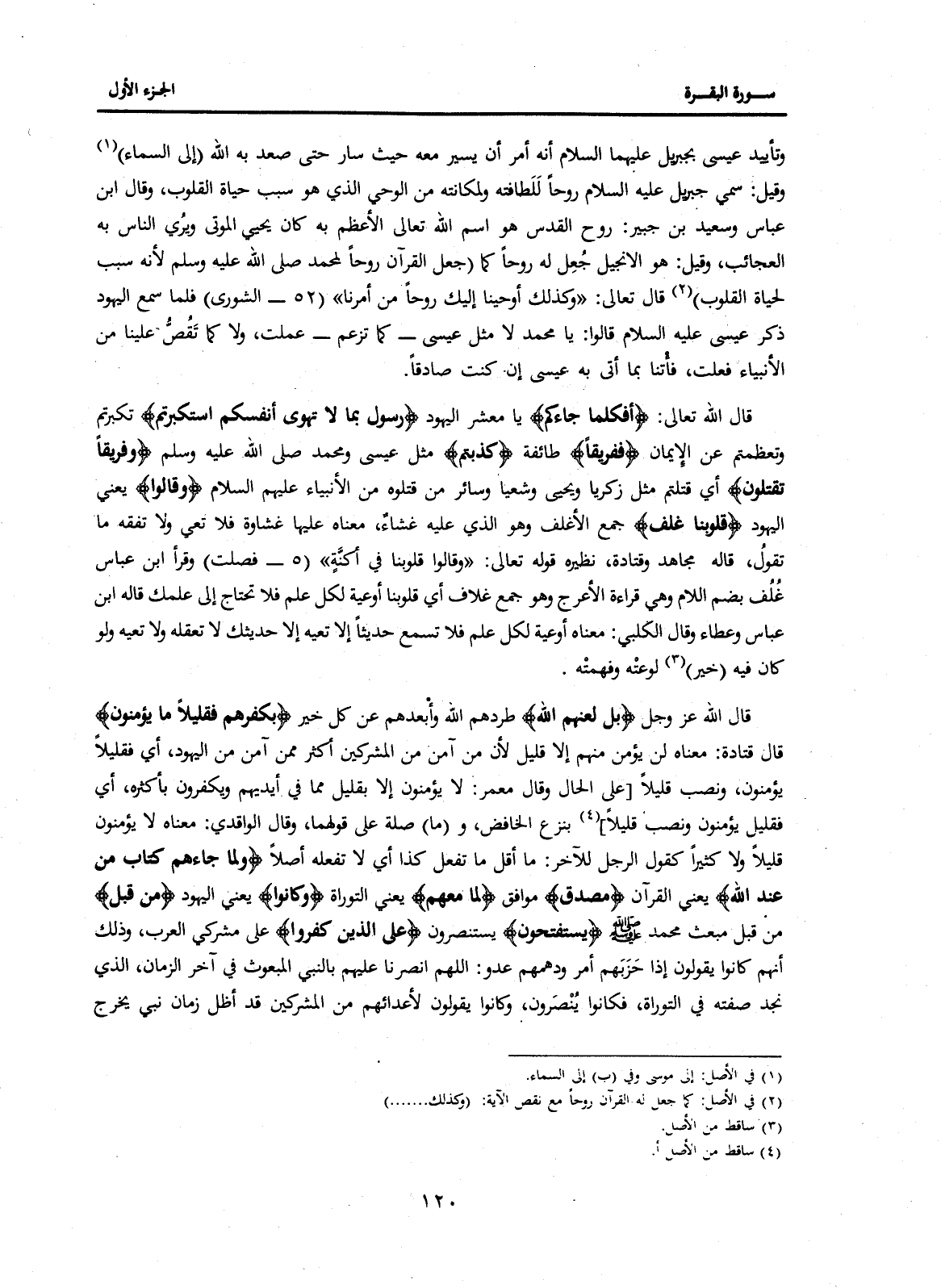 وَتَأْيِيدُ عِيسَى بِجِبْرِيلَ عَلَيْهِمَا السَّلَامُ أَنَّهُ أُمِرَ أَنْ يَسِيرَ مَعَهُ حَيْثُ سَارَ حَتَّى صَعِدَ بِهِ اللَّهُ {إِلَى السَّمَاءِ} (1) وَقِيلَ: سُمِّيَ جِبْرِيلُ عَلَيْهِ السَّلَامُ رُوحًا لِلَطَافَتِهِ وَلِمَكَانَتِهِ مِنَ الْوَحْيِ الَّذِي هُوَ سَبَبُ حَيَاةِ الْقُلُوبِ، وَقَالَ ابْنُ عَبَّاسٍ وَسَعِيدُ بْنُ جُبَيْرٍ: رُوحُ الْقُدُسِ هُوَ اسْمُ اللَّهِ تَعَالَى الْأَعْظَمُ بِهِ كَانَ يُحْيِي الْمَوْتَى وَيُرِي النَّاسَ بِهِ الْعَجَائِبَ، وَقِيلَ: هُوَ الْإِنْجِيلُ جَعَلَ لَهُ رُوحًا كَمَا {جَعْلَ الْقُرْآنَ رُوحًا لِمُحَمَّدٍ صَلَّى اللَّهُ عَلَيْهِ وَسَلَّمَ لِأَنَّهُ سَبَبٌ لِحَيَاةِ الْقُلُوبِ} (2) قَالَ تَعَالَى: "وَكَذَلِكَ أَوْحَيْنَا إِلَيْكَ رُوحًا مِنْ أَمْرِنَا" (52-الشُّورَى) فَلَمَّا سَمِعَ الْيَهُودُ ذِكْرَ عِيسَى عَلَيْهِ السَّلَامُ فَقَالُوا: يَا مُحَمَّدُ لَا مِثْلَ عِيسَى -كَمَا تَزْعُمُ-عَمِلْتَ، وَلَا كَمَا تَقُصُّ عَلَيْنَا مِنَ الْأَنْبِيَاءِ فَعَلْتَ، فَأْتِنَا بِمَا أَتَى بِهِ عِيسَى إِنْ كُنْتَ صَادِقًا.