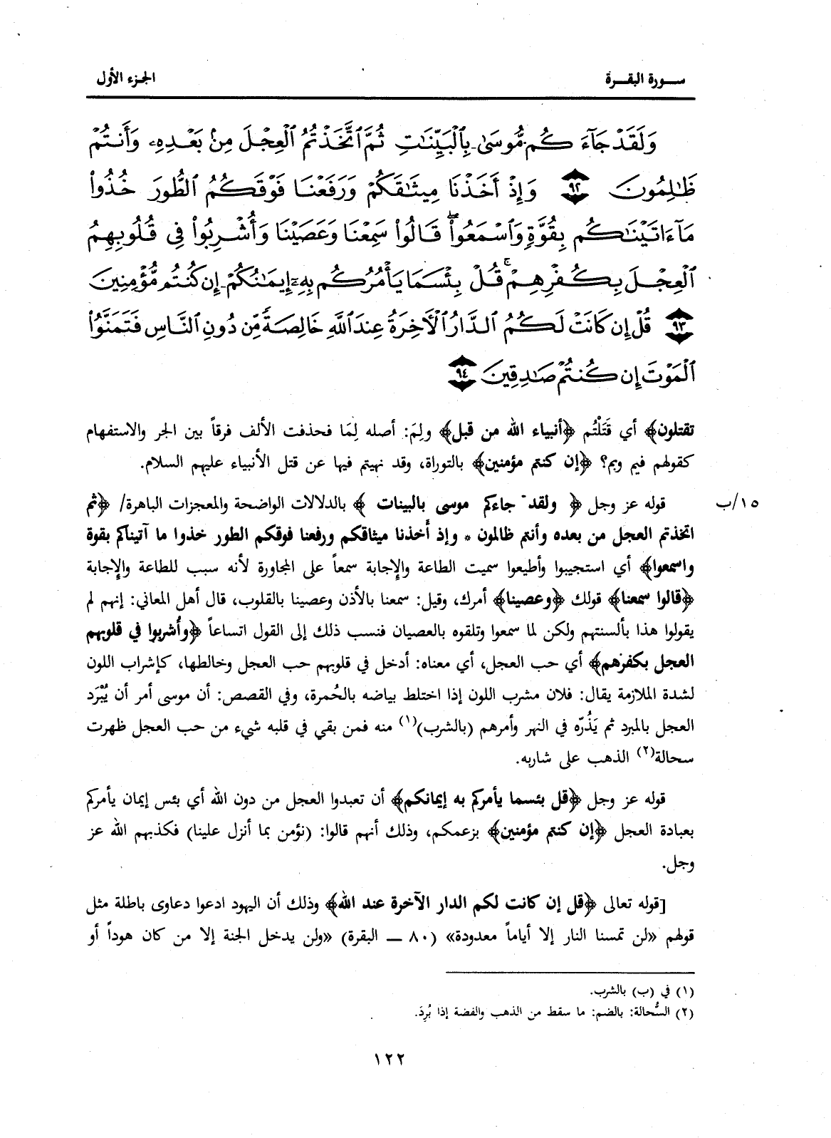 {وَإِذْ أَخَذْنَا مِيثَاقَكُمْ وَرَفَعْنَا فَوْقَكُمُ الطُّورَ خُذُوا مَا آتَيْنَاكُمْ بِقُوَّةٍ وَاسْمَعُوا} أَيِ اسْتَجِيبُوا وَأَطِيعُوا سُمِّيَتِ الطَّاعَةُ وَالْإِجَابَةُ سَمْعًا عَلَى الْمُجَاوَرَةِ لِأَنَّهُ سَبَبٌ لِلطَّاعَةِ وَالْإِجَابَةِ {قَالُوا سَمِعْنَا} {وَعَصَيْنَا} أَمْرَكَ، وَقِيلَ: سَمِعْنَا بِالْأُذُنِ وَعَصَيْنَا بِالْقُلُوبِ، قَالَ أَهْلُ الْمَعَانِي: إِنَّهُمْ لَمْ يَقُولُوا هَذَا بِأَلْسِنَتِهِمْ وَلَكِنْ لَمَّا سَمِعُوهُ وَتَلَقَّوْهُ بِالْعِصْيَانِ فَنُسِبَ ذَلِكَ إِلَى الْقَوْلِ اتِّسَاعًا {وَأُشْرِبُوا فِي قُلُوبِهِمُ الْعِجْلَ بِكُفْرِهِمْ} أَيْ حُبَّ الْعِجْلِ، أَيْ مَعْنَاهُ: أُدْخِلَ فِي قُلُوبِهِمْ حُبُّ الْعَجَلِ وَخَالَطَهَا، كَإِشْرَابِ اللَّوْنِ لِشِدَّةِ الْمُلَازَمَةِ يُقَالُ: فُلَانٌ مُشْرَبُ اللَّوْنِ إِذَا اخْتَلَطَ بَيَاضُهُ بِالْحُمْرَةِ، وَفِي الْقِصَصِ: أَنَّ مُوسَى أُمِرَ أَنْ يُبْرَدَ الْعِجْلُ بِالْمِبْرَدِ ثُمَّ يَذُرَّهُ فِي النَّهْرِ وَأَمَرَهُمْ (بِالشُّرْبِ) (1) مِنْهُ فَمَنْ بَقِيَ فِي قَلْبِهِ شَيْءٌ مِنْ حُبِّ الْعِجْلِ ظَهَرَتْ سُحَالَةُ (2) الذَّهَبِ عَلَى شَارِبِهِ.