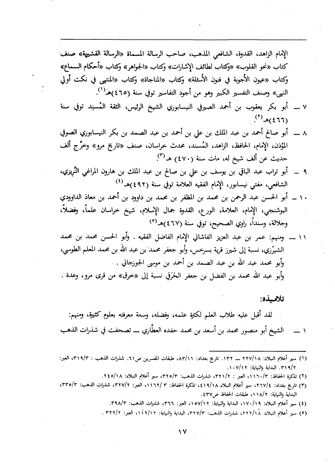 11- ومنهم: عمر بن عبد العزيز الفاشاني الإمام الفاضل الفقيه. وأبو الحسن محمد بن محمد الشيرّزي، نسبة إلى شيرز قرية بسرخس، وأبو جعفر محمد بن عبد الله بن محمد المعلم الطوسي، وأبو محمد عبد الله بن عبد الصمد بن أحمد بن موسى الجوزجاني.