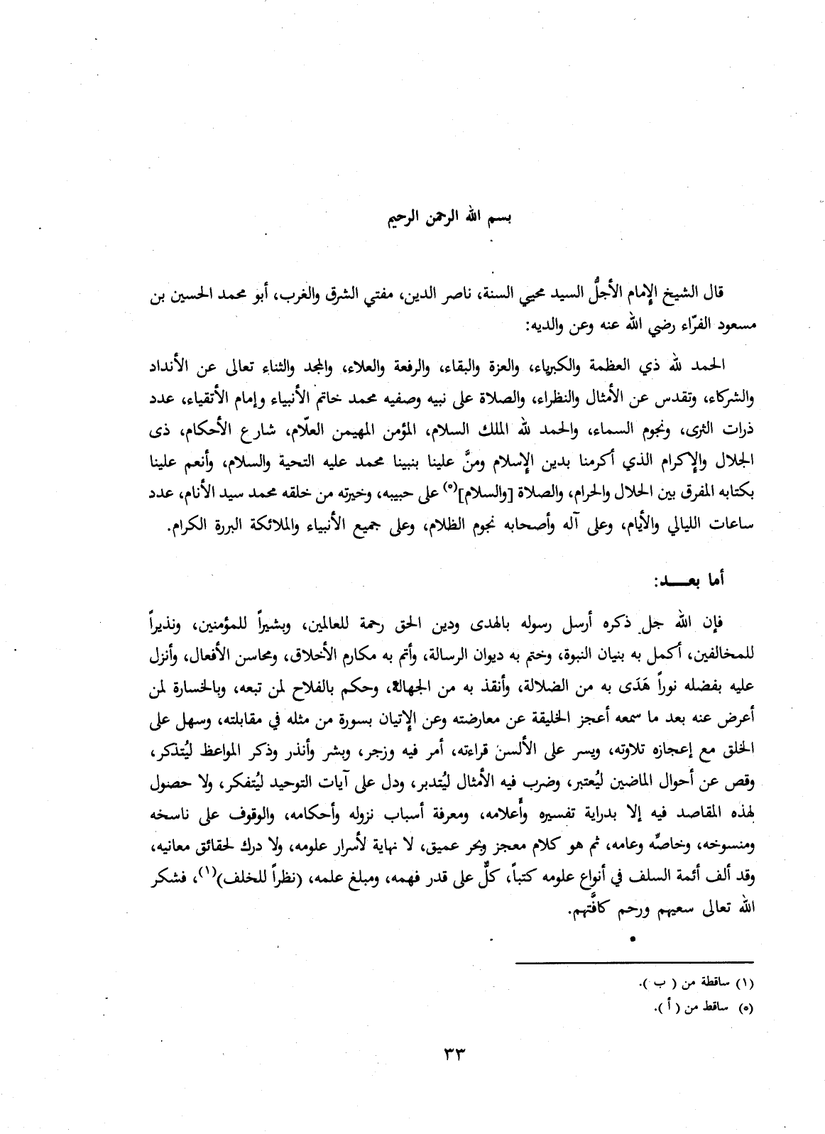 [قَالَ الشَّيْخُ الْإِمَامُ الْأَجَلُّ السَّيِّدُ مُحْيِي السُّنَّةِ، نَاصِرُ الْحَدِيثِ، رُكْنُ الدِّينِ، أَبُو مُحَمَّدٍ الْحُسَيْنُ ابن مَسْعُودٍ الْفَرَّاءُ رَحِمَهُ اللَّهُ] (2) .