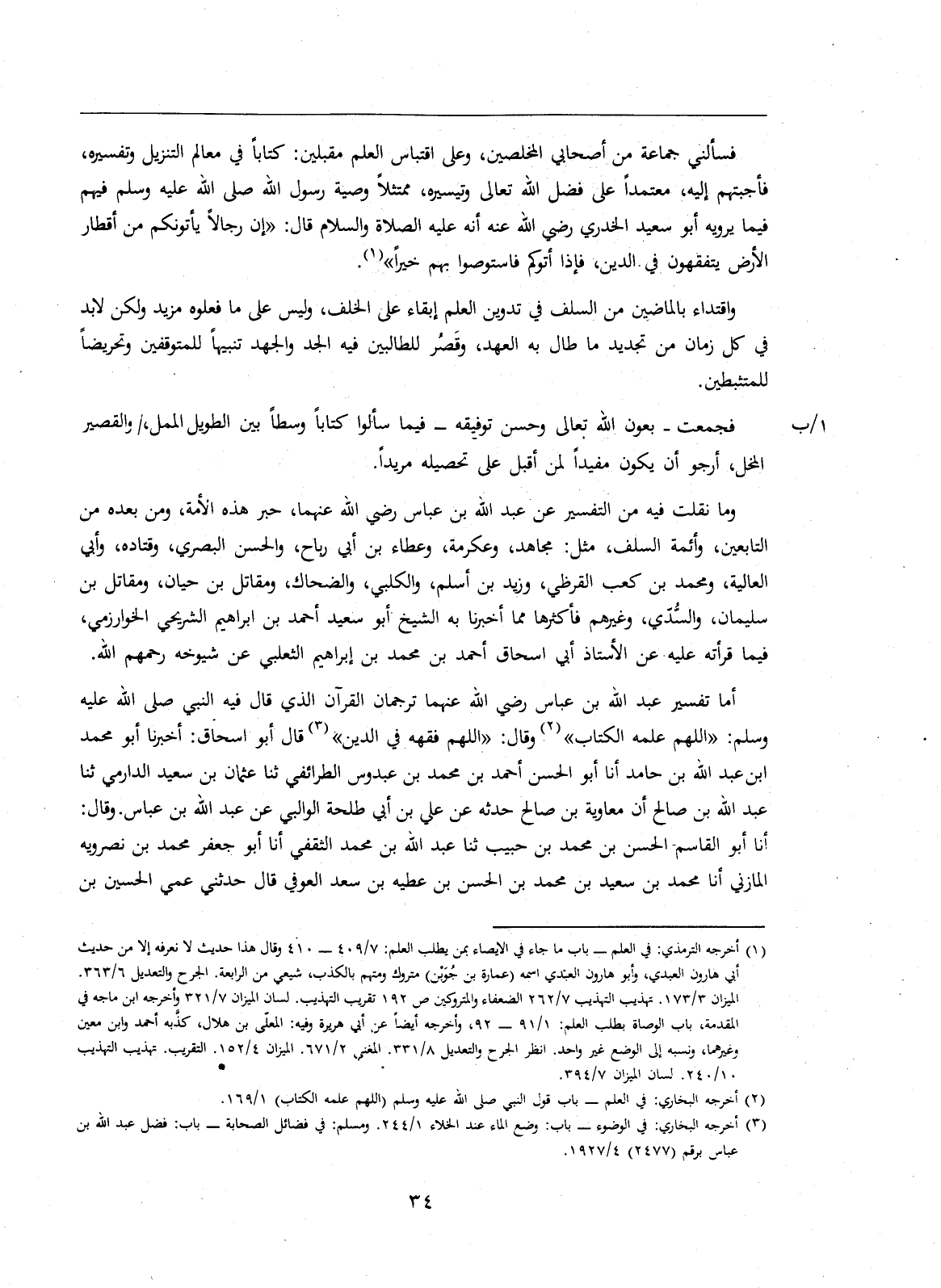 * أَمَّا تَفْسِيرُ عَبْدِ اللَّهِ بْنِ عَبَّاسٍ رَضِيَ اللَّهُ عَنْهُمَا تُرْجُمَانِ الْقُرْآنِ الَّذِي قَالَ فِيهِ النَّبِيُّ صَلَّى اللَّهُ عَلَيْهِ وَسَلَّمَ: " اللَّهُمَّ عَلِّمْهُ الْكِتَابَ " (2) وَقَالَ: " اللَّهُمَّ فَقِّهْهُ فِي الدِّينِ " (3) قَالَ أَبُو إِسْحَاقَ: أَخْبَرَنَا أَبُو مُحَمَّدِ ابن عَبْدِ اللَّهِ بْنِ حَامِدٍ أَنَا أَبُو الْحَسَنِ أَحْمَدُ بْنُ مُحَمَّدِ بْنِ عَبْدُوسٍ الطَّرَائِفِيُّ ثَنَا عُثْمَانُ بْنُ سَعِيدٍ الدَّارِمِيُّ ثَنَا عَبْدُ اللَّهِ بْنُ صَالِحٍ أَنَّ مُعَاوِيَةَ بْنَ صَالِحٍ حَدَّثَهُ عَنْ عَلِيِّ بْنِ أَبِي طَلْحَةَ الْوَالِبِيِّ عَنْ عَبْدِ اللَّهِ بْنِ عَبَّاسٍ. وَقَالَ: أَنَا أَبُو الْقَاسِمِ الْحَسَنُ بْنُ مُحَمَّدِ بْنِ حَبِيبٍ ثَنَا عَبْدُ اللَّهِ بْنُ مُحَمَّدٍ الثَّقَفِيُّ أَنَا أَبُو جَعْفَرٍ مُحَمَّدُ بْنُ نَصْرَوَيْهِ الْمَازِنِيُّ أَنَا مُحَمَّدُ بْنُ سَعِيدِ بْنِ مُحَمَّدِ بْنِ الْحَسَنِ بْنِ عطيه بْنِ سَعْدٍ الْعَوْفِيُّ قَالَ حَدَّثَنِي عَمِّي الْحُسَيْنُ بْنُ