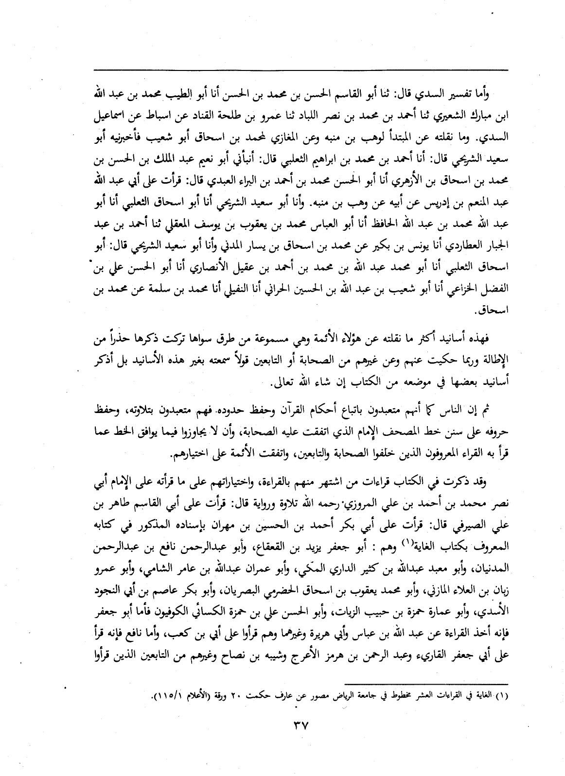 وَقَدْ ذَكَرْتُ فِي الْكِتَابِ قِرَاءَاتِ مَنِ اشْتُهِرَ مِنْهُمْ بِالْقِرَاءَةِ، وَاخْتِيَارَاتِهِمْ عَلَى مَا قَرَأْتُهُ عَلَى الْإِمَامِ أَبِي نَصْرٍ مُحَمَّدِ بْنِ أَحْمَدَ بْنِ عَلِيٍّ الْمَرْوَزِيِّ رَحِمَهُ اللَّهُ تِلَاوَةً وَرِوَايَةً قَالَ: قَرَأْتُ عَلَى أَبِي الْقَاسِمِ طَاهِرِ بْنِ عَلِيٍّ الصَّيْرَفِيِّ قَالَ: قَرَأْتُ عَلَى أَبِي بَكْرٍ أَحْمَدَ بْنِ الْحُسَيْنِ بْنِ مِهْرَانَ بِإِسْنَادِهِ الْمَذْكُورِ فِي كِتَابِهِ الْمَعْرُوفِ بِكِتَابِ الْغَايَةِ (1) وَهُمْ: أَبُو جَعْفَرٍ يَزِيدُ بْنُ الْقَعْقَاعِ، وَأَبُو عَبْدِ الرَّحْمَنِ نَافِعُ بْنُ عَبْدِ الرَّحْمَنِ الْمَدَنِيَّانِ، وَأَبُو مَعْبَدٍ عَبْدُ اللَّهِ بْنُ كَثِيرٍ الدَّارِيُّ الْمَكِّيُّ، وَأَبُو عِمْرَانَ عَبْدُ اللَّهِ بْنُ عَامِرٍ الشَّامِيُّ، وَأَبُو عَمْرٍو زَبَّانُ بْنُ الْعَلَاءِ الْمَازِنِيُّ، وَأَبُو مُحَمَّدٍ يَعْقُوبُ بْنُ إِسْحَاقَ الْحَضْرَمِيُّ الْبَصْرِيَّانِ، وَأَبُو بَكْرٍ عَاصِمُ بْنُ أَبِي النَّجُودِ الْأَسَدِيُّ، وَأَبُو عُمَارَةَ حَمْزَةُ بْنُ حَبِيبٍ الزَّيَّاتُ، وَأَبُو الْحَسَنِ عَلِيُّ بْنُ حَمْزَةَ الْكِسَائِيُّ الْكُوفِيُّونَ فَأَمَّا أَبُو جَعْفَرٍ فَإِنَّهُ أَخَذَ الْقِرَاءَةَ عَنْ عَبْدِ اللَّهِ بْنِ عَبَّاسٍ وَأَبِي هُرَيْرَةَ وَغَيْرِهِمَا وَهُمْ قرأوا عَلَى أُبَيِّ بْنِ كَعْبٍ، وَأَمَّا نَافِعٌ فَإِنَّهُ قَرَأَ عَلَى أَبِي جَعْفَرٍ الْقَارِئِ وَعَبْدِ الرَّحْمَنِ بْنِ هُرْمُزَ الْأَعْرَجِ وَشَيْبَةَ بْنِ نِصَاحٍ وَغَيْرِهِمْ مِنَ التَّابِعِينَ الَّذِينَ قرأوا