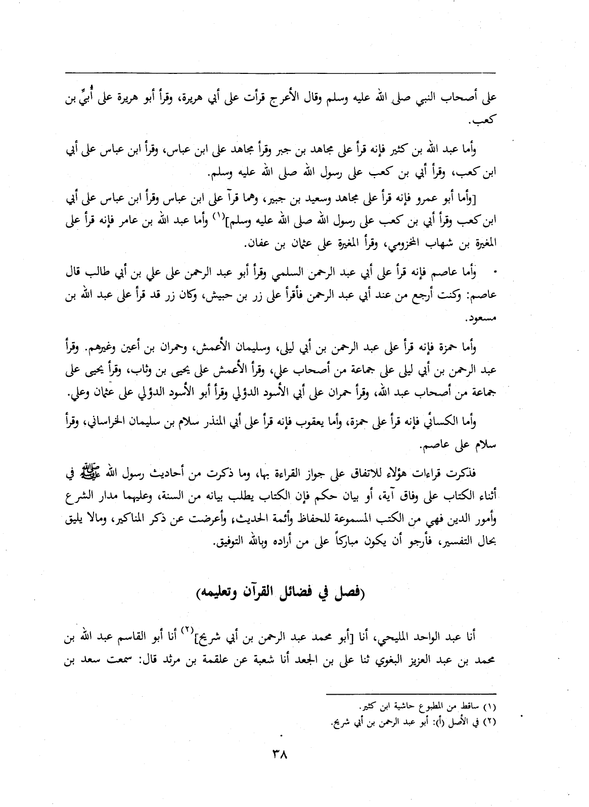 [وَأَمَّا أَبُو عَمْرٍو فَإِنَّهُ قَرَأَ عَلَى مُجَاهِدٍ وَسَعِيدِ بْنِ جُبَيْرٍ، وَهُمَا قَرَآ عَلَى ابْنِ عَبَّاسٍ وَقَرَأَ ابْنُ عَبَّاسٍ عَلَى أُبَيِّ ابن كَعْبٍ وَقَرَأَ أُبَيُّ بْنُ كَعْبٍ عَلَى رَسُولِ اللَّهِ صَلَّى اللَّهُ عَلَيْهِ وَسَلَّمَ] (1) وَأَمَّا عَبْدُ اللَّهِ بْنُ عَامِرٍ فَإِنَّهُ قَرَأَ عَلَى الْمُغِيرَةِ بْنِ شِهَابٍ الْمَخْزُومِيِّ، وَقَرَأَ الْمُغِيرَةُ عَلَى عُثْمَانَ بْنِ عَفَّانَ.