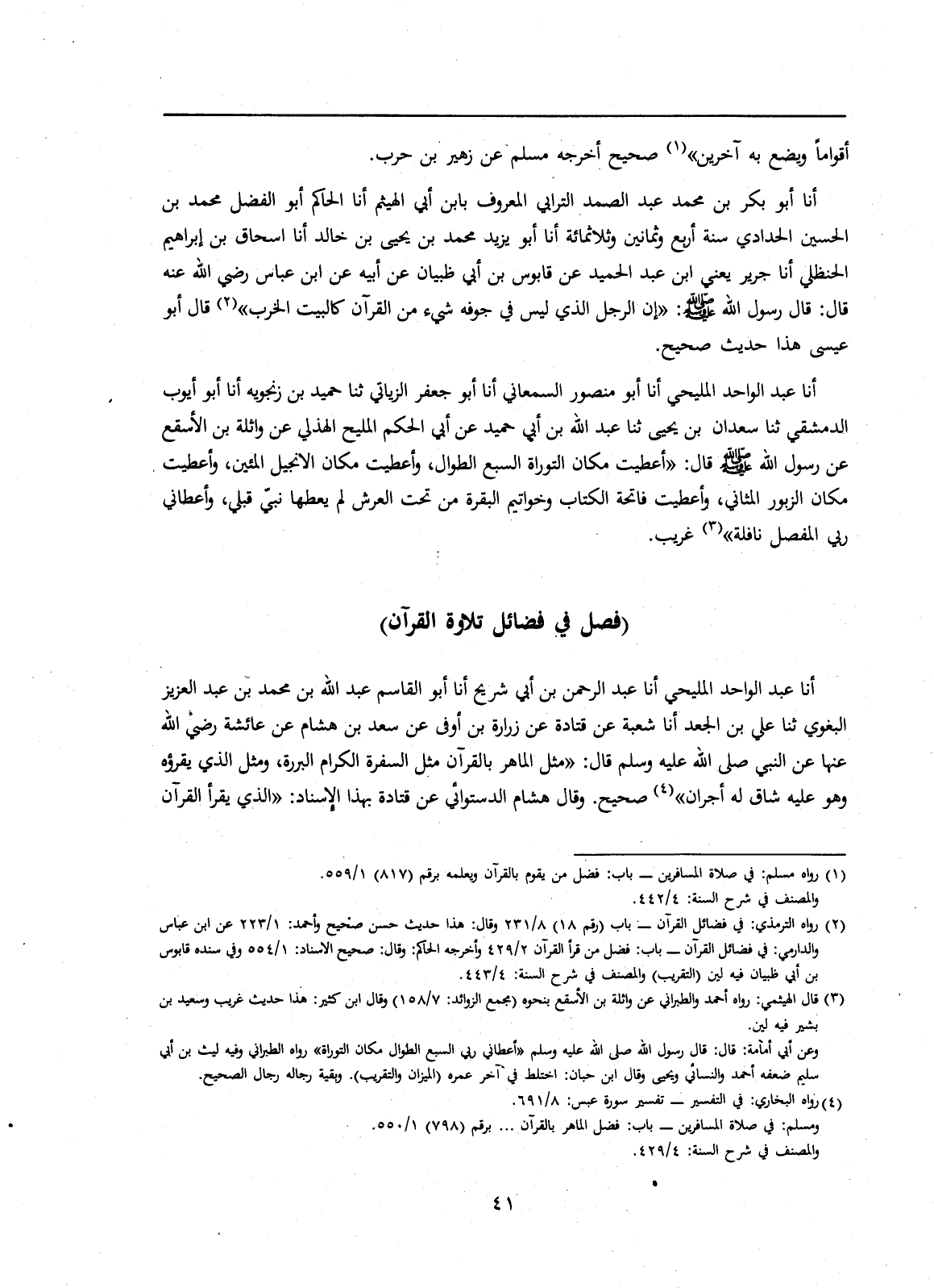 أَنَا عَبْدُ الْوَاحِدِ الْمَلِيحِيُّ أَنَا عَبْدُ الرَّحْمَنِ بْنُ أَبِي شُرَيْحٍ أَنَا أَبُو الْقَاسِمِ عَبْدُ اللَّهِ بْنُ مُحَمَّدِ بْنِ عَبْدِ الْعَزِيزِ الْبَغَوِيُّ ثَنَا عَلِيُّ بْنُ الْجَعْدِ أَنَا شُعْبَةُ عَنْ قَتَادَةَ عَنْ زُرَارَةَ بْنِ أَوْفَى عَنْ سَعْدِ بْنِ هِشَامٍ عَنْ عَائِشَةَ رَضِيَ اللَّهُ عَنْهَا عَنِ النَّبِيِّ صَلَّى اللَّهُ عَلَيْهِ وَسَلَّمَ قَالَ: " مَثَلُ الْمَاهِرِ بِالْقُرْآنِ مَثَلُ السَّفَرَةِ الْكِرَامِ الْبَرَرَةِ، وَمَثَلُ الَّذِي يَقْرَؤُهُ وَهُوَ عَلَيْهِ شَاقٌّ لَهُ أَجْرَانِ " (1) صَحِيحٌ. وَقَالَ هِشَامٌ الدَّسْتُوَائِيُّ عَنْ قَتَادَةَ بِهَذَا الْإِسْنَادِ: " الَّذِي يَقْرَأُ الْقُرْآنَ