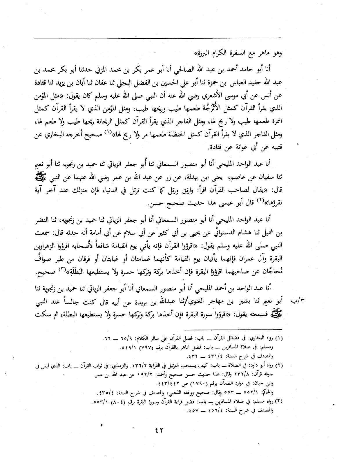 أَنَا عَبْدُ الْوَاحِدِ الْمَلِيحِيُّ أَنَا أَبُو مَنْصُورٍ السَّمْعَانِيُّ أَنَا أَبُو جَعْفَرٍ الزَّيَّاتِيُّ ثَنَا حُمَيْدُ بْنُ زَنْجُوَيْهِ، ثَنَا النَّضِرُ بْنُ شُمَيْلٍ ثَنَا هِشَامٌ الدَّسْتُوَائِيُّ عَنْ يَحْيَى بْنِ أَبِي كَثِيرٍ عَنْ أَبِي سَلَّامٍ عَنْ أَبِي أُمَامَةَ أَنَّهُ حَدَّثَهُ قَالَ: سَمِعْتُ النبي صَلَّى اللَّهُ عَلَيْهِ وَسَلَّمَ يقول: " اقرؤوا الْقُرْآنَ فَإِنَّهُ يَأْتِي يَوْمَ الْقِيَامَةِ شافعًا لأصحابه اقرؤوا الزَّهْرَاوَيْنِ الْبَقَرَةَ وَآلَ عِمْرَانَ فَإِنَّهُمَا يَأْتِيَانِ يَوْمَ الْقِيَامَةِ كَأَنَّهُمَا غَمَامَتَانِ أَوْ غَيَايَتَانِ أَوْ فِرْقَانِ مِنْ طَيْرٍ صَوَافَّ تُحَاجَّانِ عَنْ صَاحِبِهِمَا اقْرَءُوا الْبَقَرَةَ فَإِنَّ أَخْذَهَا بَرَكَةٌ وَتَرْكَهَا حَسْرَةٌ وَلَا يَسْتَطِيعُهَا الْبَطَلَةُ " (3) صَحِيحٌ.
