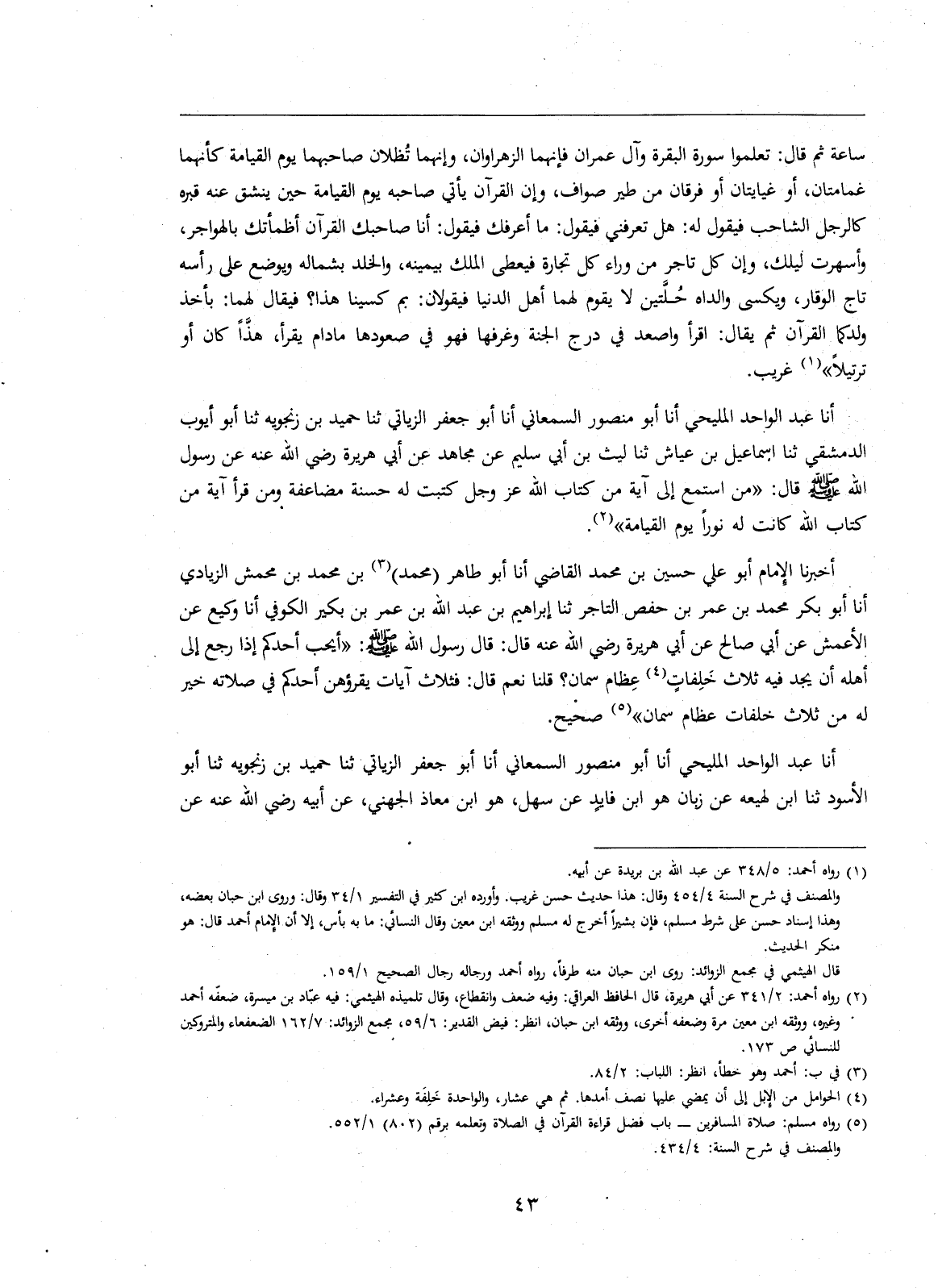 سَاعَةً ثُمَّ قَالَ: تَعَلَّمُوا سُورَةَ الْبَقَرَةِ وَآلَ عِمْرَانَ فَإِنَّهُمَا الزَّهْرَاوَانِ، وَإِنَّهُمَا تُظِلَّانِ صَاحِبَهُمَا يَوْمَ الْقِيَامَةِ كَأَنَّهُمَا غَمَامَتَانِ، أَوْ غَيَايَتَانِ أَوْ فِرْقَانِ مِنْ طَيْرٍ صَوَّافَّ، وَإِنَّ الْقُرْآنَ يَأْتِي صَاحِبَهُ يَوْمَ الْقِيَامَةِ حِينَ يَنْشَقُّ عَنْهُ قَبْرُهُ كَالرَّجُلِ الشَّاحِبِ فَيَقُولُ لَهُ: هَلْ تَعْرِفُنِي فَيَقُولُ: مَا أَعْرِفُكَ فَيَقُولُ: أَنَا صَاحِبُكَ الْقُرْآنُ أَظْمَأْتُكَ بِالْهَوَاجِرِ، وَأَسْهَرْتُ لَيْلَكَ، وَإِنَّ كُلَّ تَاجِرٍ مِنْ وَرَاءِ كُلِّ تِجَارَةٍ فَيُعْطَى الْمُلْكَ بِيَمِينِهِ، وَالْخُلْدَ بِشِمَالِهِ وَيُوضَعُ عَلَى رَأْسِهِ تَاجُ الْوَقَارِ، وَيُكْسَى وَالِدَاهُ حُلَّتَيْنِ لَا يَقُومُ لَهُمَا أَهْلُ الدُّنْيَا فَيَقُولَانِ: بِمَ كُسِينَا هَذَا؟ فَيُقَالُ لَهُمَا: بِأَخْذِ وَلَدِكُمَا الْقُرْآنَ ثُمَّ يُقَالُ: اقْرَأْ وَاصْعَدْ فِي دَرَجِ الْجَنَّةِ وَغُرَفِهَا فَهُوَ في صعودها ما دام يَقْرَأُ، هَذًّا كَانَ أَوْ تَرْتِيلًا " (1) غَرِيبٌ.