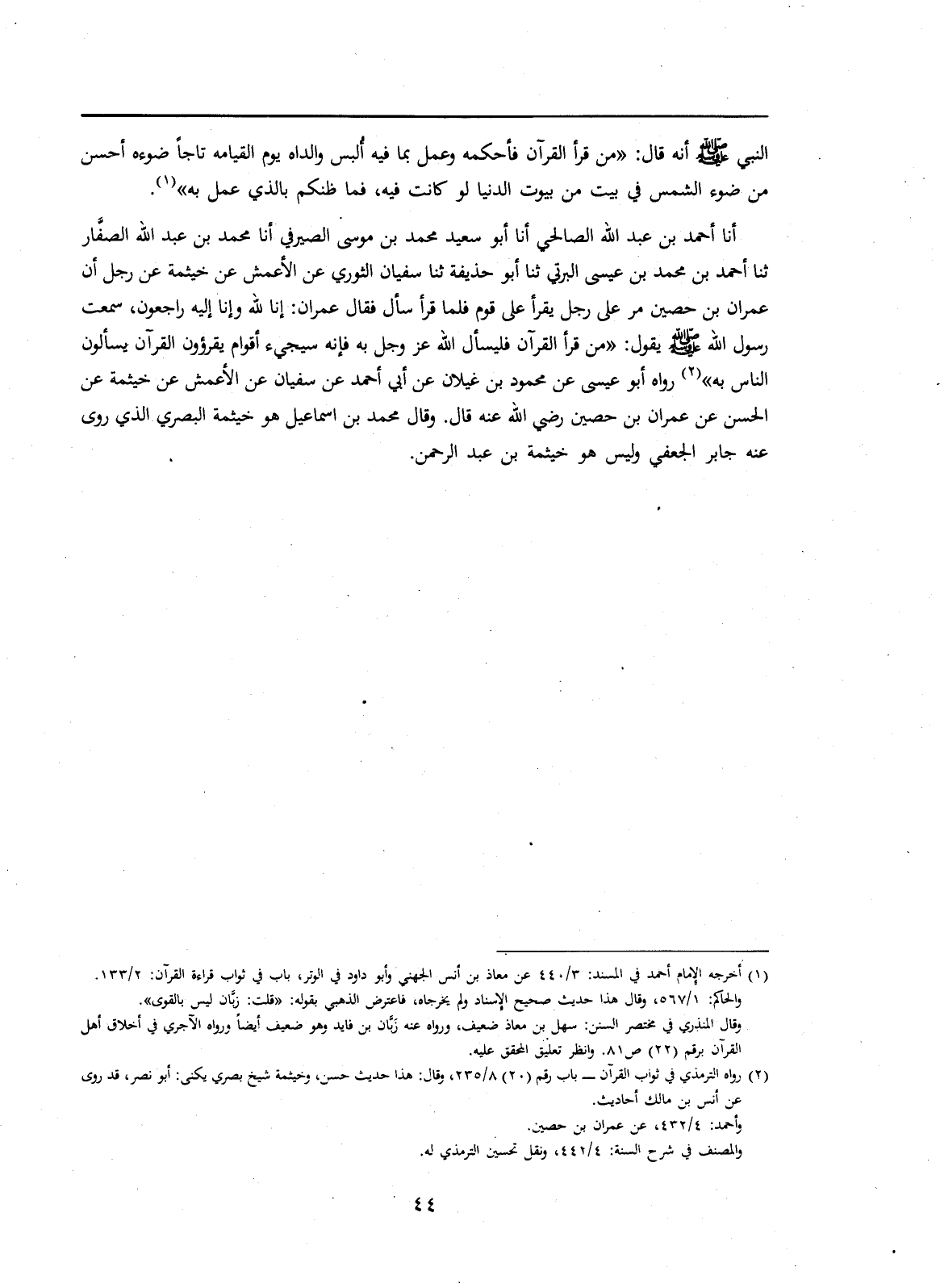 (2) رواه الترمذي في ثواب القرآن - باب رقم (20) 8/235، وقال: هذا حديث حسن، وخيثمة شيخ بصري يكنى: أبو نصر، قد روى عن أنس بن مالك أحاديث.