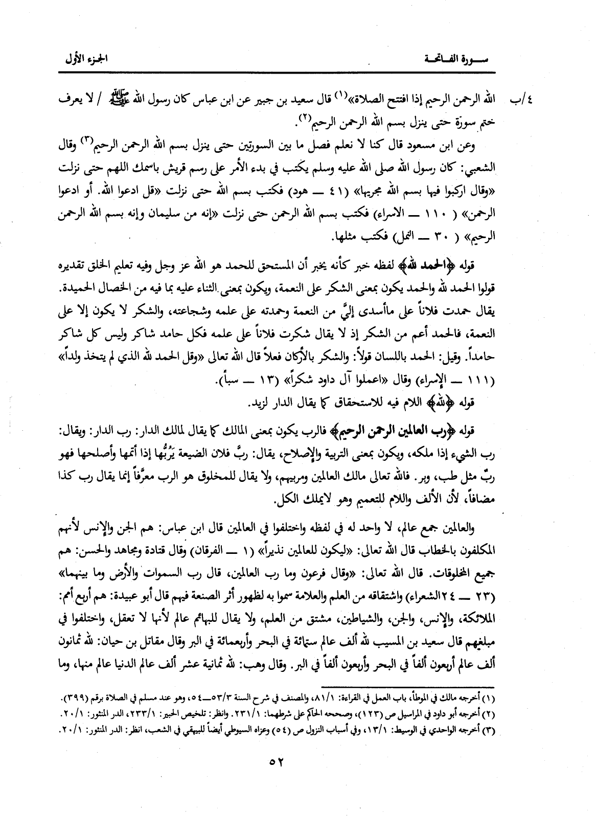 اللَّهِ الرَّحْمَنِ الرَّحِيمِ إِذَا افْتَتَحَ الصَّلَاةَ" (1) قَالَ سَعِيدُ بْنُ جُبَيْرٍ عَنِ ابْنِ عَبَّاسٍ كَانَ رسول الله صَلَّى اللَّهُ عَلَيْهِ وَسَلَّمَ 4\ب لَا يَعْرِفُ خَتْمَ سُورَةٍ حَتَّى يَنْزِلَ بِسْمِ اللَّهِ الرَّحْمَنِ الرَّحِيمِ (2) .