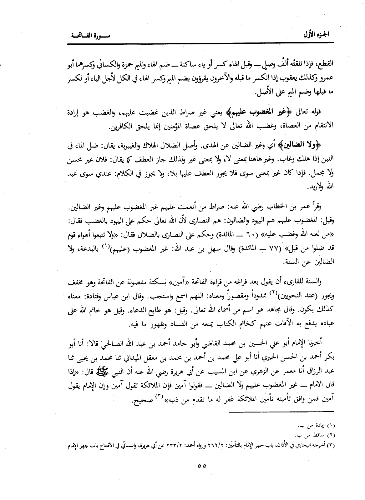 وَقَرَأَ عُمَرُ بْنُ الْخَطَّابِ رَضِيَ اللَّهُ عَنْهُ: صِرَاطَ مَنْ أَنْعَمْتَ عَلَيْهِمْ غَيْرِ الْمَغْضُوبِ عَلَيْهِمْ وَغَيْرِ الضَّالِّينَ. وَقِيلَ: الْمَغْضُوبُ عَلَيْهِمْ هُمُ الْيَهُودُ وَالضَّالُّونَ: هُمُ النَّصَارَى لِأَنَّ اللَّهَ تَعَالَى حَكَمَ عَلَى الْيَهُودِ بِالْغَضَبِ فَقَالَ: "مَنْ لَعَنَهُ اللَّهُ وَغَضِبَ عَلَيْهِ" (60-الْمَائِدَةِ) وَحَكَمَ عَلَى النَّصَارَى بِالضَّلَالِ فَقَالَ "وَلَا تَتَّبِعُوا أَهْوَاءَ قَوْمٍ قَدْ ضَلُّوا مِنْ قَبْلُ" (77-الْمَائِدَةِ) وَقَالَ سَهْلُ بْنُ عَبْدِ اللَّهِ: غَيْرِ الْمَغْضُوبِ {عَلَيْهِمْ} (1) بِالْبِدْعَةِ، وَلَا الضَّالِّينَ عَنِ السُّنَّةِ.
