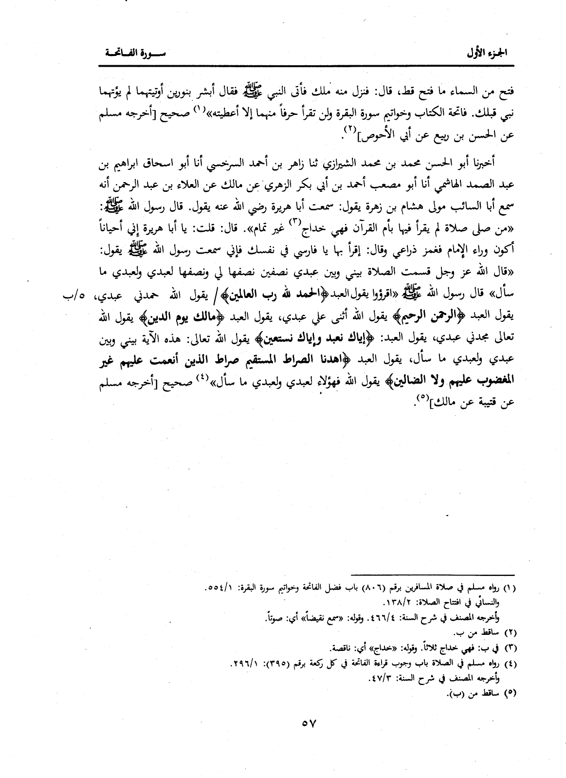 (4) رواه مسلم في الصلاة باب وجوب قراءة الفاتحة في كل ركعة برقم (395) : 1 / 296. وأخرجه المصنف في شرح السنة: 3 / 47.