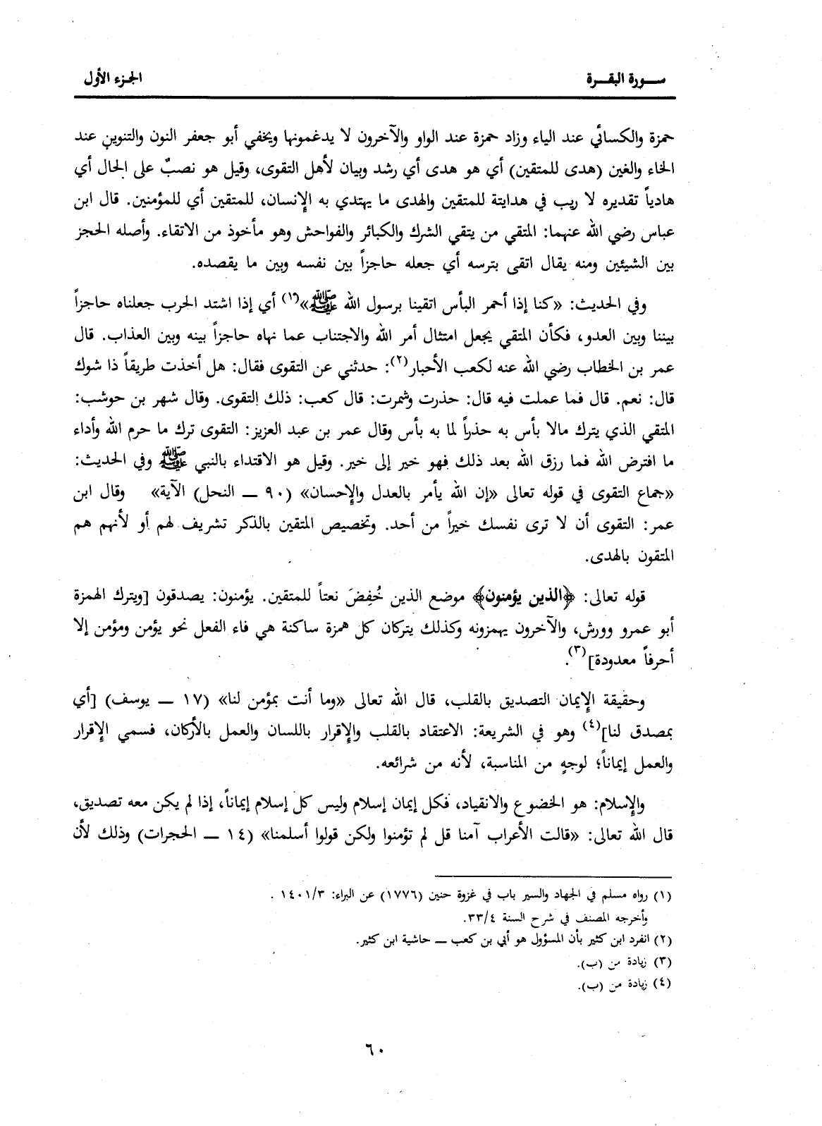 وَفِي الْحَدِيثِ: "كُنَّا إِذَا احْمَرَّ الْبَأْسُ اتَّقَيْنَا بِرَسُولِ اللَّهِ صَلَّى اللَّهُ عَلَيْهِ وَسَلَّمَ" (1) أَيْ إِذَا اشْتَدَّ الْحَرْبُ جَعَلْنَاهُ حَاجِزًا بَيْنَنَا وَبَيْنَ الْعَدُوِّ، فَكَأَنَّ الْمُتَّقِي يَجْعَلُ امْتِثَالَ أَمْرِ اللَّهِ وَالِاجْتِنَابَ عَمَّا نَهَاهُ حَاجِزًا بَيْنَهُ وَبَيْنَ الْعَذَابِ. قَالَ عُمَرُ بْنُ الْخَطَّابِ رَضِيَ اللَّهُ عَنْهُ لِكَعْبِ الْأَحْبَارِ (2) حَدِّثْنِي عَنِ التَّقْوَى فَقَالَ: هَلْ أَخَذْتَ طَرِيقًا ذَا شَوْكٍ قَالَ: نَعَمْ. قَالَ فَمَا عَمِلْتَ فِيهِ قَالَ: حَذِرْتُ وَشَمَّرْتُ: قَالَ كَعْبٌ: ذَلِكَ التَّقْوَى. وَقَالَ شَهْرُ بْنُ حَوْشَبٍ: الْمُتَّقِي الَّذِي يَتْرُكُ مَا لَا بَأْسَ بِهِ حَذَرًا لِمَا بِهِ بَأْسٌ وَقَالَ عُمَرُ بْنُ عَبْدِ الْعَزِيزِ: التَّقْوَى تَرْكُ مَا حَرَّمَ اللَّهُ وَأَدَاءُ مَا افْتَرَضَ اللَّهُ فَمَا رَزَقَ اللَّهُ بَعْدَ ذَلِكَ فَهُوَ خَيْرٌ إِلَى خَيْرٍ. وَقِيلَ هُوَ الِاقْتِدَاءُ بِالنَّبِيِّ صَلَّى اللَّهُ عَلَيْهِ وَسَلَّمَ وَفِي الْحَدِيثِ: "جِمَاعُ التَّقْوَى فِي قَوْلِهِ تَعَالَى "إِنَّ اللَّهَ يَأْمُرُ بِالْعَدْلِ وَالْإِحْسَانِ" (90-النَّحْلِ) الْآيَةَ. وَقَالَ ابْنُ عُمَرَ: التَّقْوَى أَنْ لَا تَرَى نَفْسَكَ خَيْرًا مِنْ أَحَدٍ. وَتَخْصِيصُ الْمُتَّقِينَ بِالذِّكْرِ تَشْرِيفٌ لَهُمْ أَوْ لِأَنَّهُمْ هُمُ الْمُتَّقُونَ بِالْهُدَى.