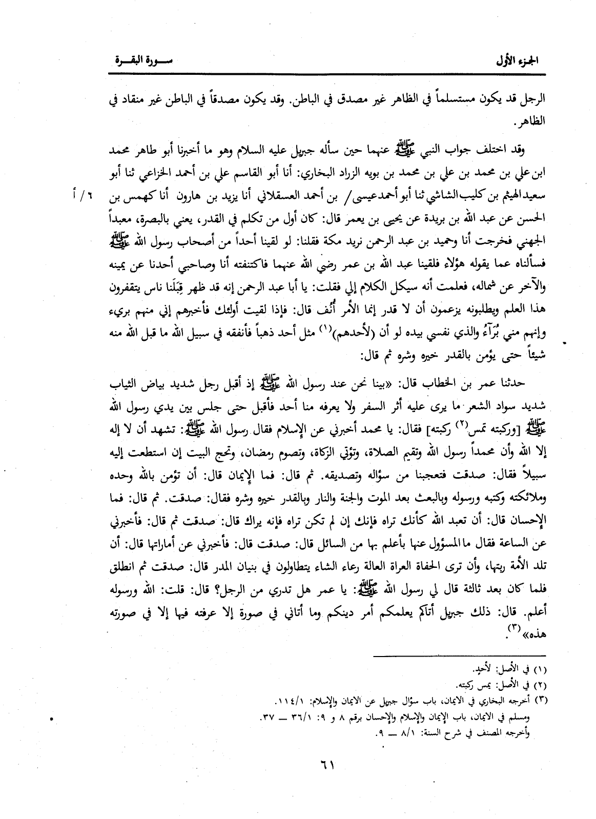 (3) أخرجه البخاري في الإيمان، باب سؤال جبريل عن الإيمان والإسلام: 1 / 114. ومسلم في الإيمان، باب الإيمان والإسلام والإحسان برقم 8و9: 1 / 36-37. وأخرجه المصنف في شرح السنة: 1 / 8-9.