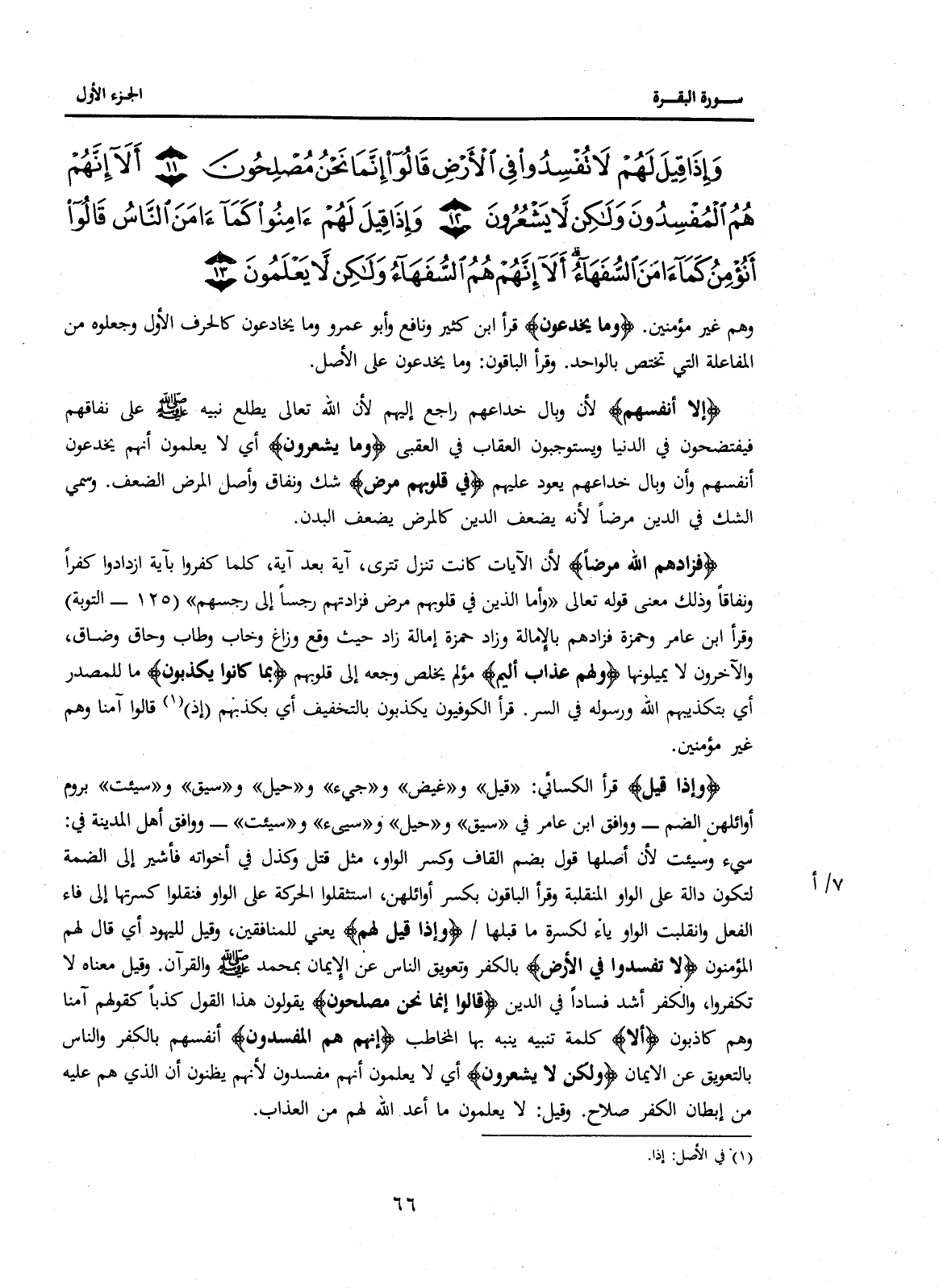 {وَإِذَا قِيلَ} قَرَأَ الْكِسَائِيُّ: "قِيلَ" وَ"غِيضَ" وَ"جِيءَ" وَ"حِيلَ" وَ"سِيقَ" وَ"سِيئَتْ" بِرَوْمِ أَوَائِلِهِنَّ الضَّمَّ -وَوَافَقَ ابْنَ عَامِرٍ فِي "سِيقَ" وَ"حِيلَ" وَ"سِيءَ" وَ"سِيئَتْ" -وَوَافَقَ أَهْلَ الْمَدِينَةِ فِي: سِيءَ وَسِيئَتْ لِأَنَّ أَصْلَهَا قُوِلَ بِضَمِّ الْقَافِ وَكَسْرِ الْوَاوِ، مِثْلَ قُتِلَ =وَكَذَلِكَ فِي أَخَوَاتِهِ فَأُشِيرَ إِلَى الضَّمَّةِ لِتَكُونَ دَالَّةً عَلَى الْوَاوِ الْمُنْقَلِبَةِ وَقَرَأَ الْبَاقُونَ بِكَسْرِ أَوَائِلِهِنَّ، اسْتَثْقَلُوا الْحَرَكَةَ عَلَى الْوَاوِ فَنَقَلُوا كَسْرَتَهَا إِلَى فَاءِ الْفِعْلِ وَانْقَلَبَتِ الْوَاوُ يَاءً لِكَسْرَةِ ما قبلها 7/أ {وَإِذَا قِيلَ لَهُمْ} يَعْنِي لِلْمُنَافِقِينَ، وَقِيلَ لِلْيَهُودِ أَيْ قَالَ لَهُمُ الْمُؤْمِنُونَ {لَا تُفْسِدُوا فِي الْأَرْضِ} بِالْكُفْرِ وَتَعْوِيقِ النَّاسِ عَنِ الْإِيمَانِ بِمُحَمَّدٍ صَلَّى اللَّهُ عَلَيْهِ وَسَلَّمَ وَالْقُرْآنِ. وَقِيلَ مَعْنَاهُ لَا تَكْفُرُوا، وَالْكُفْرُ أَشَدُّ فَسَادًا فِي الدِّينِ {قَالُوا إِنَّمَا نَحْنُ مُصْلِحُونَ} يَقُولُونَ هَذَا الْقَوْلَ كَذِبًا كَقَوْلِهِمْ آمَنَّا وَهُمْ كَاذِبُونَ