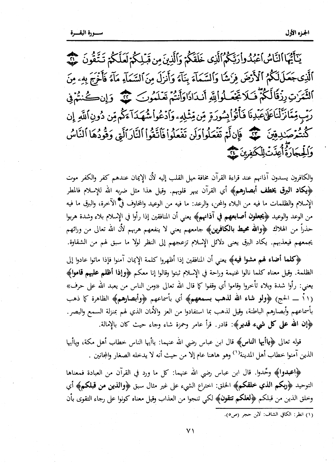 {يَا أَيُّهَا النَّاسُ اعْبُدُوا رَبَّكُمُ الَّذِي خَلَقَكُمْ وَالَّذِينَ مِنْ قَبْلِكُمْ لَعَلَّكُمْ تَتَّقُونَ (21) الَّذِي جَعَلَ لَكُمُ الْأَرْضَ فِرَاشًا وَالسَّمَاءَ بِنَاءً وَأَنْزَلَ مِنَ السَّمَاءِ مَاءً فَأَخْرَجَ بِهِ مِنَ الثَّمَرَاتِ رِزْقًا لَكُمْ فَلَا تَجْعَلُوا لِلَّهِ أَنْدَادًا وَأَنْتُمْ تَعْلَمُونَ (22) وَإِنْ كُنْتُمْ فِي رَيْبٍ مِمَّا نَزَّلْنَا عَلَى عَبْدِنَا فَأْتُوا بِسُورَةٍ مِنْ مِثْلِهِ وَادْعُوا شُهَدَاءَكُمْ مِنْ دُونِ اللَّهِ إِنْ كُنْتُمْ صَادِقِينَ (23) فَإِنْ لَمْ تَفْعَلُوا وَلَنْ تَفْعَلُوا فَاتَّقُوا النَّارَ الَّتِي وَقُودُهَا النَّاسُ وَالْحِجَارَةُ أُعِدِّتْ لِلْكَافِرِينَ (24) }