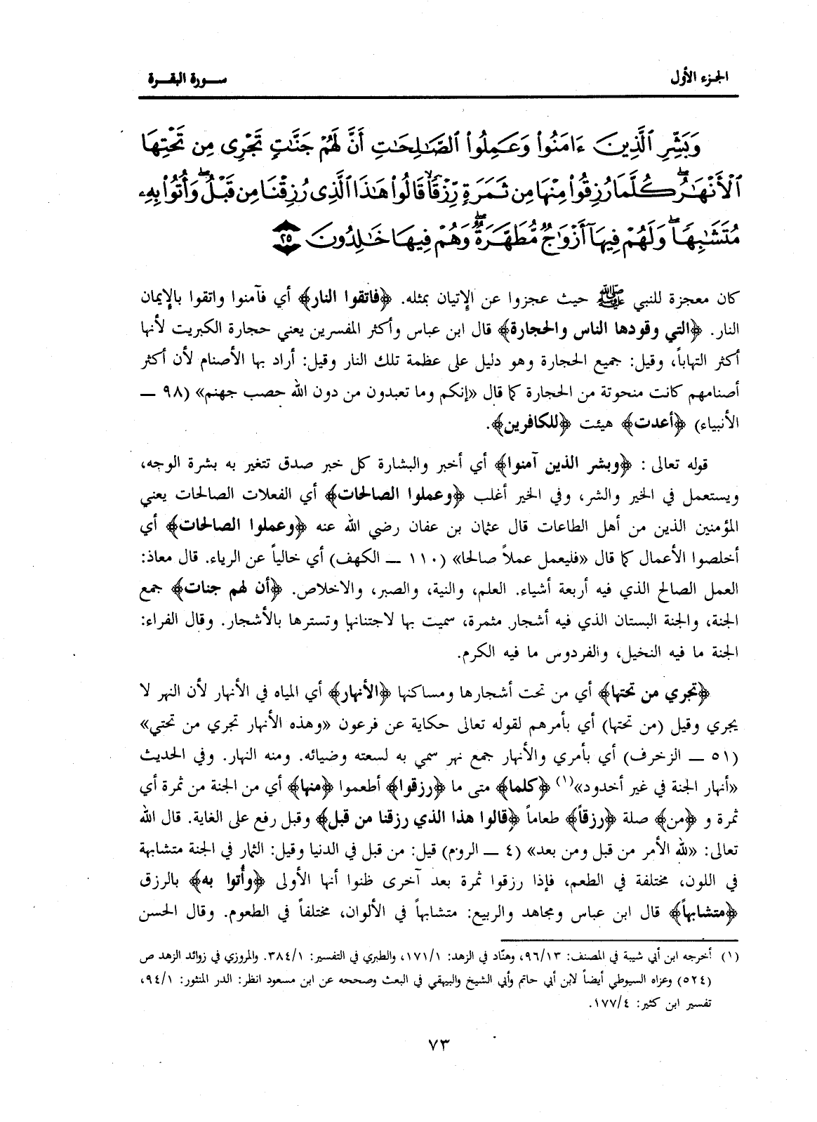 قَوْلُهُ تَعَالَى: {وَبَشِّرِ الَّذِينَ آمَنُوا} أَيْ أَخْبِرْ وَالْبِشَارَةُ كُلُّ خَبَرِ صِدْقٍ تَتَغَيَّرُ بِهِ بَشَرَةُ الْوَجْهِ، وَيُسْتَعْمَلُ فِي الْخَيْرِ وَالشَّرِّ، وَفِي الْخَيْرِ أَغْلَبُ {وَعَمِلُوا الصَّالِحَاتِ} أَيِ الْفِعْلَاتِ الصَّالِحَاتِ يَعْنِي الْمُؤْمِنِينَ الَّذِينَ هُمْ مِنْ أَهْلِ الطَّاعَاتِ قَالَ عُثْمَانُ بْنُ عَفَّانَ رَضِيَ اللَّهُ عَنْهُ {وَعَمِلُوا الصَّالِحَاتِ} أَيْ أَخْلَصُوا الْأَعْمَالَ كَمَا قَالَ "فَلْيَعْمَلْ عَمَلًا صَالِحًا" (110-الْكَهْفِ) أَيْ خَالِيًا مِنَ الرِّيَاءِ. قَالَ مُعَاذٌ: الْعَمَلُ الصَّالِحُ الَّذِي فِيهِ أَرْبَعَةُ أَشْيَاءَ. الْعِلْمُ، وَالنِّيَّةُ، وَالصَّبْرُ، وَالْإِخْلَاصُ. {أَنَّ لَهُمْ جَنَّاتٍ} جَمْعُ الْجَنَّةِ، وَالْجَنَّةُ الْبُسْتَانُ الَّذِي فِيهِ أَشْجَارٌ مُثْمِرَةٌ، سُمِّيَتْ بِهَا لِاجْتِنَانِهَا وَتَسَتُّرِهَا بِالْأَشْجَارِ. وَقَالَ الْفَرَّاءُ: الْجَنَّةُ مَا فِيهِ النَّخِيلُ، وَالْفِرْدَوْسُ مَا فِيهِ الْكَرْمُ.