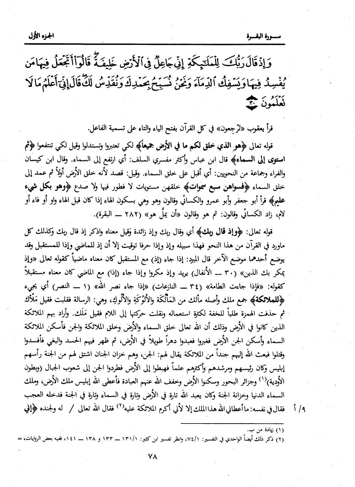 قَوْلُهُ تَعَالَى {وَإِذْ قَالَ رَبُّكَ} أَيْ وَقَالَ رَبُّكَ وَإِذْ زَائِدَةٌ وَقِيلَ مَعْنَاهُ وَاذْكُرْ إِذْ قَالَ رَبُّكَ وَكَذَلِكَ كَلُّ مَا وَرَدَ فِي الْقُرْآنِ مِنْ هَذَا النَّحْوِ فَهَذَا سَبِيلُهُ وَإِذْ وَإِذَا حَرْفَا تَوْقِيتٍ إِلَّا أَنَّ إِذْ لِلْمَاضِي وَإِذَا لِلْمُسْتَقْبَلِ وَقَدْ يُوضَعُ أَحَدُهُمَا مَوْضِعَ الْآخَرِ قَالَ الْمُبَرِّدُ: إِذَا جَاءَ {إِذْ} مَعَ الْمُسْتَقْبَلِ كَانَ مَعْنَاهُ مَاضِيًا كَقَوْلِهِ تَعَالَى "وَإِذْ يَمْكُرُ بِكَ الَّذِينَ" (30-الْأَنْفَالِ) يُرِيدُ وَإِذْ مَكَرُوا وَإِذَا جَاءَ {إِذَا} مَعَ الْمَاضِي كَانَ مَعْنَاهُ مُسْتَقْبَلًا كَقَوْلِهِ: "فَإِذَا جَاءَتِ الطَّامَّةُ" (34-النَّازِعَاتِ) "إِذَا جَاءَ نَصْرُ اللَّهِ" (1-النَّصْرِ) أَيْ يَجِيءُ {لِلْمَلَائِكَةِ} جَمْعُ مَلَكٍ وَأَصْلُهُ مَأْلَكٌ مِنَ الْمَأْلَكَةِ وَالْأَلُوكَةِ وَالْأُلُوكِ، وَهِيَ: الرِّسَالَةُ فَقُلِبَتْ فَقِيلَ مَلْأَكٌ ثُمَّ حُذِفَتِ الْهَمْزَةُ طَلَبًا لِلْخِفَّةِ لِكَثْرَةِ اسْتِعْمَالِهِ وَنُقِلَتْ حَرَكَتُهَا إِلَى اللَّامِ فَقِيلَ مَلَكٌ. وَأَرَادَ بِهِمُ الْمَلَائِكَةَ الَّذِينَ كَانُوا فِي الْأَرْضِ وَذَلِكَ أَنَّ اللَّهَ تَعَالَى خَلَقَ السَّمَاءَ وَالْأَرْضَ وَخَلَقَ الْمَلَائِكَةَ وَالْجِنَّ فَأَسْكَنَ الْمَلَائِكَةَ السَّمَاءَ وَأَسْكَنَ الْجِنَّ الْأَرْضَ فَغَبَرُوا فَعَبَدُوا دَهْرًا طَوِيلًا فِي الْأَرْضِ، ثُمَّ ظَهَرَ فِيهِمُ الْحَسَدُ وَالْبَغْيُ فَأَفْسَدُوا وَقَتَلُوا فَبَعَثَ اللَّهُ إِلَيْهِمْ جُنْدًا مِنَ الْمَلَائِكَةِ يُقَالُ لَهُمُ: الْجِنُّ، وَهُمْ خُزَّانُ الْجِنَانِ اشْتَقَّ لَهُمْ مِنَ الْجَنَّةِ رَأَسَهُمْ إِبْلِيسَ وَكَانَ رَئِيسَهُمْ وَمُرْشِدَهُمْ وَأَكْثَرَهُمْ عِلْمًا فَهَبَطُوا إِلَى الْأَرْضِ فَطَرَدُوا الْجِنَّ إِلَى شُعُوبِ الْجِبَالِ (وَبُطُونِ الْأَوْدِيَةِ) (1) وَجَزَائِرِ الْبُحُورِ وَسَكَنُوا الْأَرْضَ وَخَفَّفَ اللَّهُ عَنْهُمُ الْعِبَادَةَ فَأَعْطَى اللَّهُ إِبْلِيسَ مُلْكَ الْأَرْضِ، وَمُلْكَ السَّمَاءِ الدُّنْيَا وَخِزَانَةَ الْجَنَّةِ وَكَانَ يَعْبُدُ اللَّهَ تَارَةً فِي الْأَرْضِ وَتَارَةً فِي السَّمَاءِ وَتَارَةً فِي الْجَنَّةِ فَدَخَلَهُ الْعُجْبُ فَقَالَ فِي نَفْسِهِ: مَا أَعْطَانِي اللَّهُ هَذَا الْمُلْكَ إِلَّا لِأَنِّي أَكْرَمُ الْمَلَائِكَةِ عَلَيْهِ (2) فَقَالَ الله تعالى 9/ألَهُ وَلِجُنْدِهِ: {إِنِّي جَاعِلٌ}