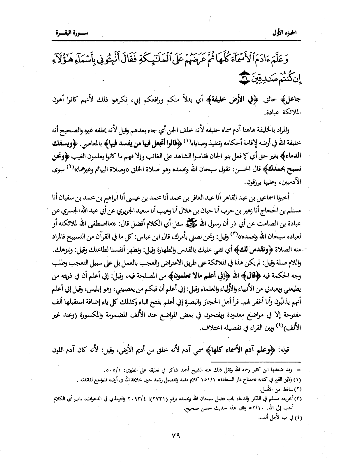 أَخْبَرَنَا إِسْمَاعِيلُ بْنُ عَبْدِ الْقَاهِرِ أَنَا عَبْدُ الْغَافِرِ بْنُ مُحَمَّدٍ أَنَا مُحَمَّدُ بْنُ عِيسَى أَنَا إِبْرَاهِيمُ بْنُ مُحَمَّدِ بْنِ سُفْيَانَ أَنَا مُسْلِمُ بْنُ الْحَجَّاجِ أَنَا زُهَيْرُ بْنُ حَرْبٍ أَنَا حَبَّانُ بْنُ هِلَالٍ أَنَا وُهَيْبٌ أَنَا سَعِيدٌ الْجَرِيرِيُّ عَنْ أَبِي عَبْدِ اللَّهِ الْجَسْرِيِّ عَنْ عُبَادَةَ بْنِ الصَّامِتِ عَنْ أَبِي ذَرٍّ أَنَّ رَسُولَ اللَّهِ صَلَّى اللَّهُ عَلَيْهِ وَسَلَّمَ سُئِلَ أَيُّ الْكَلَامِ أَفْضَلُ قَالَ: "مَا اصْطَفَى اللَّهُ لِمَلَائِكَتِهِ أَوْ لِعِبَادِهِ سُبْحَانَ اللَّهِ وَبِحَمْدِهِ" (3) وَقِيلَ: وَنَحْنُ نُصَلِّي بِأَمْرِكَ، قَالَ ابْنُ عَبَّاسٍ: كُلُّ مَا فِي الْقُرْآنِ مِنَ التَّسْبِيحِ فَالْمُرَادُ مِنْهُ الصَّلَاةُ {وَنُقَدِّسُ لَكَ} أَيْ نُثْنِي عَلَيْكَ بِالْقُدْسِ وَالطَّهَارَةِ وَقِيلَ: وَنُطَهِّرُ أَنْفُسَنَا لِطَاعَتِكَ وَقِيلَ: وَنُنَزِّهُكَ. وَاللَّامُ صِلَةٌ وَقِيلَ: لَمْ يَكُنْ هَذَا مِنَ الْمَلَائِكَةِ عَلَى طَرِيقِ الِاعْتِرَاضِ وَالْعُجْبِ بِالْعَمَلِ بَلْ عَلَى سَبِيلِ التَّعَجُّبِ وَطَلَبِ وَجْهِ الْحِكْمَةِ فِيهِ {قَالَ} اللَّهُ {إِنِّي أَعْلَمُ مَا لَا تَعْلَمُونَ} الْمَصْلَحَةَ فِيهِ، وَقِيلَ: إِنِّي أَعْلَمُ أَنَّ فِي ذُرِّيَّتِهِ مَنْ يُطِيعُنِي وَيَعْبُدُنِي مِنَ الْأَنْبِيَاءِ وَالْأَوْلِيَاءِ وَالْعُلَمَاءِ وَقِيلَ: إِنِّي أَعْلَمُ أَنَّ فِيكُمْ مَنْ يَعْصِينِي وَهُوَ إِبْلِيسُ، وَقِيلَ إِنِّي أَعْلَمُ أَنَّهُمْ يُذْنِبُونَ وَأَنَا أَغْفِرُ لَهُمْ. قَرَأَ أَهْلُ الْحِجَازِ وَالْبَصْرَةِ إِنِّيَ أَعْلَمُ بِفَتْحِ الْيَاءِ وَكَذَلِكَ كَلُّ يَاءِ إِضَافَةٍ اسْتَقْبَلَهَا أَلِفٌ مَفْتُوحَةٌ إِلَّا فِي مَوَاضِعَ مَعْدُودَةٍ وَيَفْتَحُونَ فِي بَعْضِ الْمَوَاضِعِ عِنْدَ الْأَلِفِ الْمَضْمُومَةِ وَالْمَكْسُورَةِ (وَعِنْدَ غَيْرِ الْأَلِفِ) (4) وَبَيْنَ الْقُرَّاءِ فِي تَفْصِيلِهِ اخْتِلَافٌ.