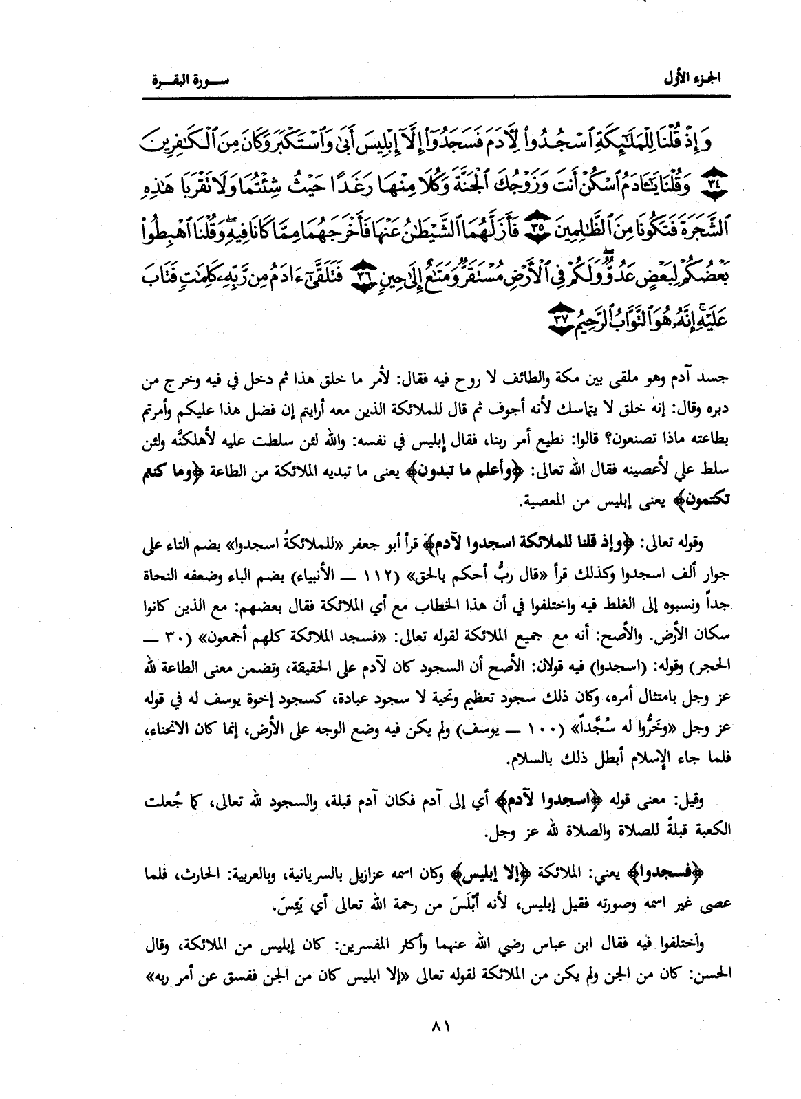 وَقَوْلُهُ تَعَالَى: {وَإِذْ قُلْنَا لِلْمَلَائِكَةِ اسْجُدُوا لِآدَمَ} قَرَأَ أَبُو جَعْفَرٍ "لِلْمَلَائِكَةُ اسْجُدُوا" بِضَمِّ التَّاءِ عَلَى جِوَارِ أَلِفِ اسْجُدُوا وَكَذَلِكَ قَرَأَ "قُلْ رَبُّ احْكُمْ بِالْحَقِّ" (112-الْأَنْبِيَاءِ) بِضَمِّ الْبَاءِ وَضَعَّفَهُ النُّحَاةُ جِدًّا وَنَسَبُوهُ إِلَى الْغَلَطِ فِيهِ وَاخْتَلَفُوا فِي أَنَّ هَذَا الْخِطَابَ مَعَ أَيِّ الْمَلَائِكَةِ فَقَالَ بَعْضُهُمْ: مَعَ الَّذِينَ كَانُوا سُكَّانَ الْأَرْضِ. وَالْأَصَحُّ: أَنَّهُ مَعَ جَمِيعِ الْمَلَائِكَةِ لِقَوْلِهِ تَعَالَى: "فَسَجَدَ الْمَلَائِكَةُ كُلُّهُمْ أَجْمَعُونَ" (30-الْحِجْرِ) وَقَوْلُهُ: {اسْجُدُوا} فِيهِ قَوْلَانِ: الْأَصَحُّ أَنَّ السُّجُودَ كَانَ لِآدَمَ عَلَى الْحَقِيقَةِ، وَتَضَمَّنَ مَعْنَى الطَّاعَةِ لِلَّهِ عَزَّ وَجَلَّ بِامْتِثَالِ أَمْرِهِ، وَكَانَ ذَلِكَ سُجُودَ تَعْظِيمٍ وَتَحِيَّةٍ لَا سُجُودَ عِبَادَةٍ، كَسُجُودِ إِخْوَةِ يُوسُفَ لَهُ فِي قَوْلِهِ عَزَّ وَجَلَّ "وَخَرُّوا لَهُ سُجَّدًا" (100-يُوسُفَ) وَلَمْ يَكُنْ فِيهِ وَضْعُ الْوَجْهِ عَلَى الْأَرْضِ، إِنَّمَا كَانَ الِانْحِنَاءُ، فَلَمَّا جَاءَ الْإِسْلَامُ أَبْطَلَ ذَلِكَ بِالسَّلَامِ.