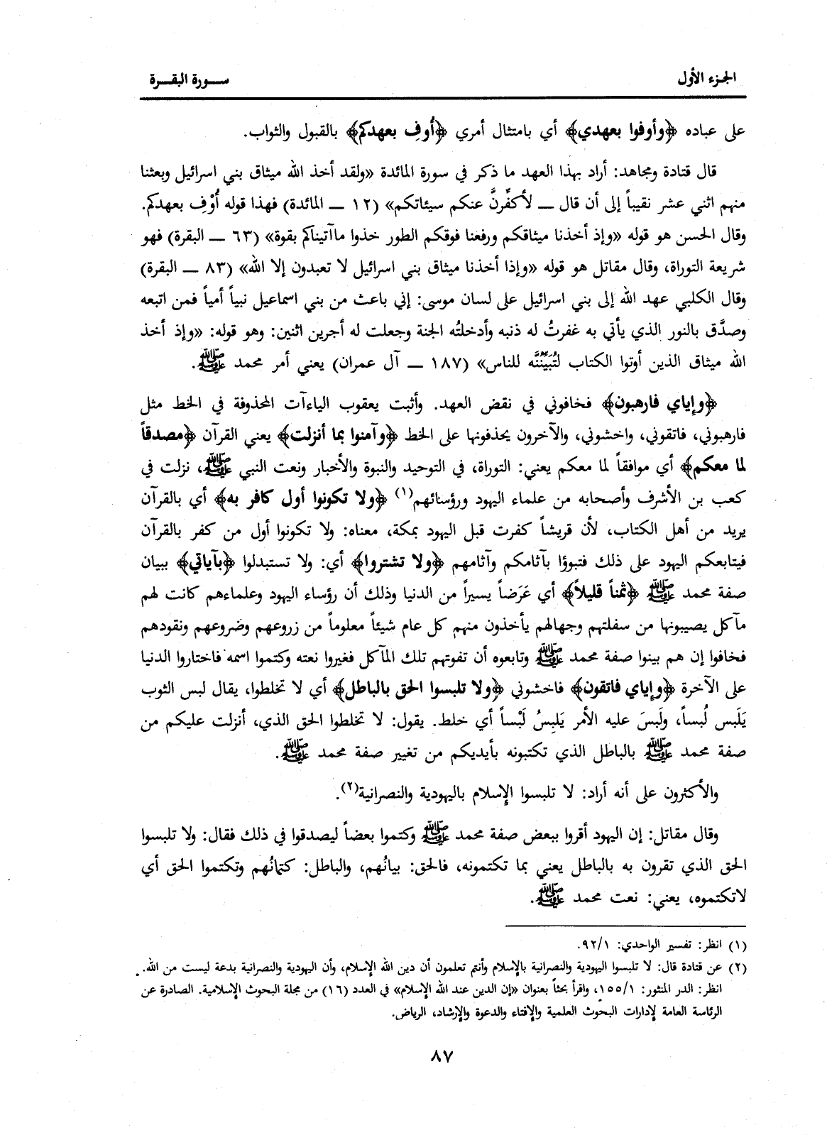 (2) عن قتادة قال: لا تلبسوا اليهودية والنصرانية بالإسلام وأنتم تعلمون أن دين الله الإسلام، وأن اليهودية والنصرانية بدعة ليست من الله. انظر: الدر المنثور: 1 / 155، واقرأ بحثا بعنوان "إن الدين عند الله الإسلام" في العدد (16) من مجلة البحوث الإسلامية. الصادرة عن الرئاسة العامة لإدارات البحوث العلمية والإفتاء والدعوة والإرشاد، الرياض.