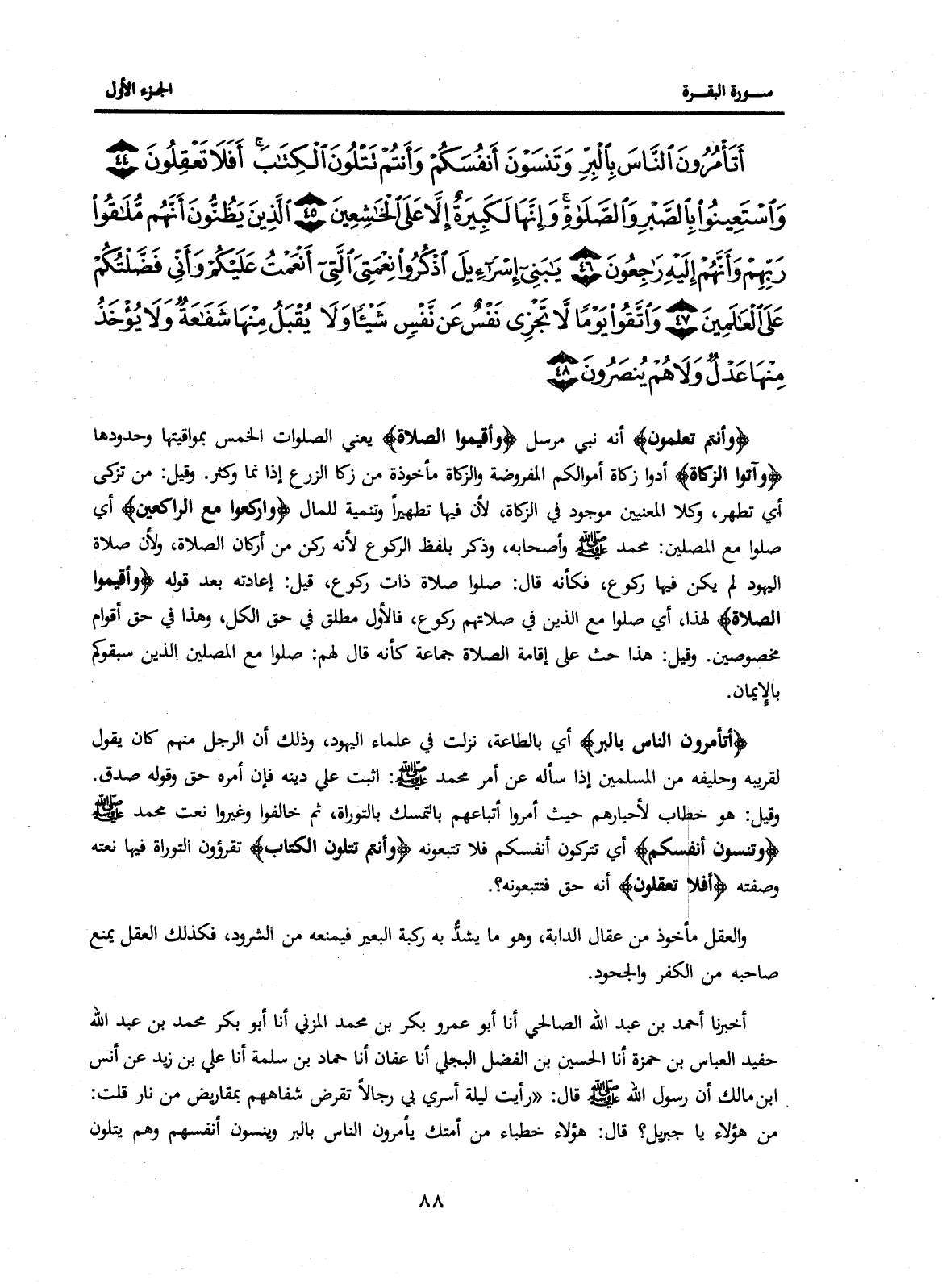 {أَتَأْمُرُونَ النَّاسَ بِالْبِرِّ وَتَنْسَوْنَ أَنْفُسَكُمْ وَأَنْتُمْ تَتْلُونَ الْكِتَابَ أَفَلَا تَعْقِلُونَ (44) وَاسْتَعِينُوا بِالصَّبْرِ وَالصَّلَاةِ وَإِنَّهَا لَكَبِيرَةٌ إِلَّا عَلَى الْخَاشِعِينَ (45) الَّذِينَ يَظُنُّونَ أَنَّهُمْ مُلَاقُو رَبِّهِمْ وَأَنَّهُمْ إِلَيْهِ رَاجِعُونَ (46) يَا بَنِي إِسْرَائِيلَ اذْكُرُوا نِعْمَتِيَ الَّتِي أَنْعَمْتُ عَلَيْكُمْ وَأَنِّي فَضَّلْتُكُمْ عَلَى الْعَالَمِينَ (47) وَاتَّقُوا يَوْمًا لَا تَجْزِي نَفْسٌ عَنْ نَفْسٍ شَيْئًا وَلَا يُقْبَلُ مِنْهَا شَفَاعَةٌ وَلَا يُؤْخَذُ مِنْهَا عَدْلٌ وَلَا هُمْ يُنْصَرُونَ (48) }