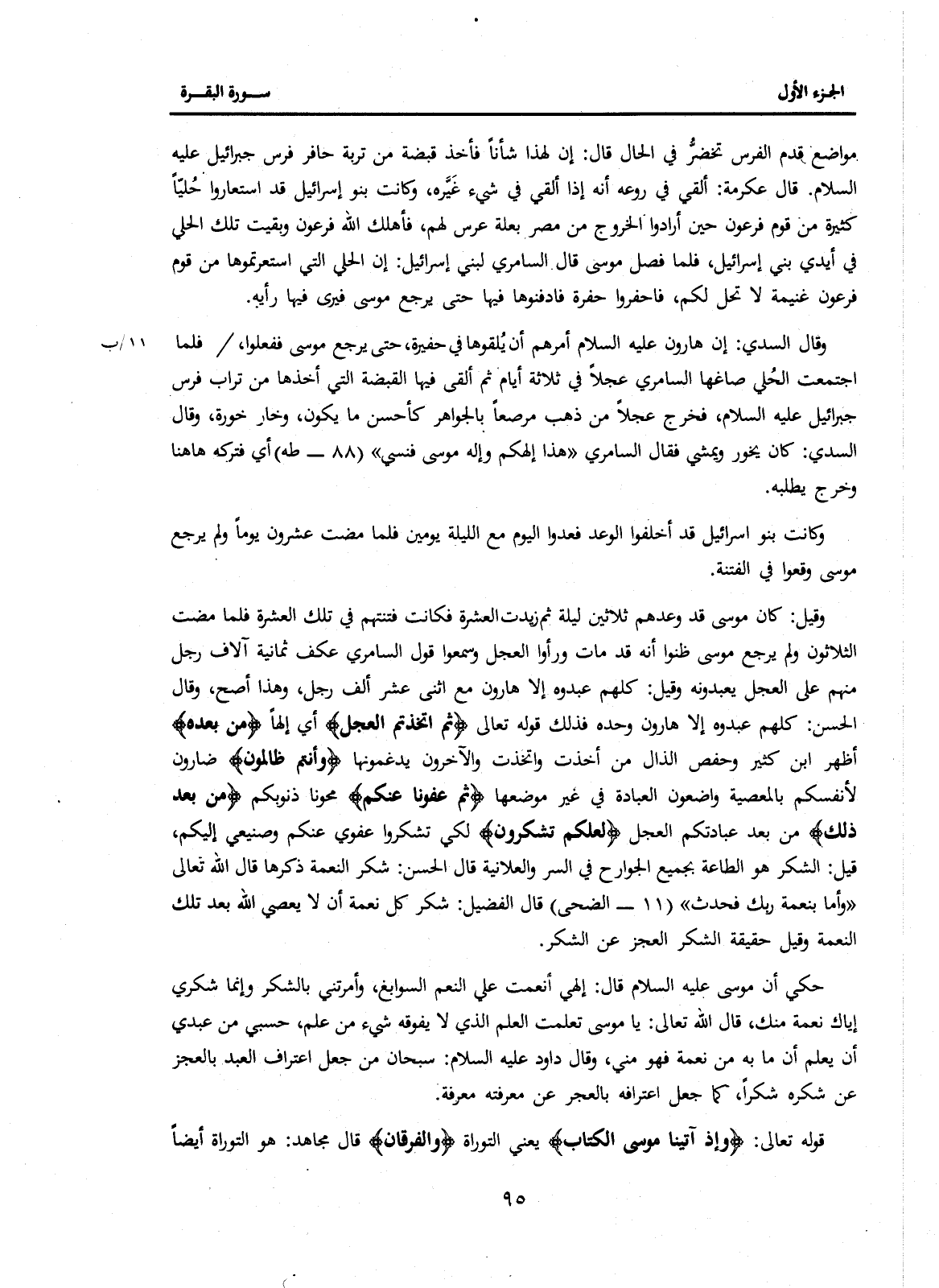 وَقَالَ السُّدِّيُّ: إِنَّ هَارُونَ عَلَيْهِ السَّلَامُ أَمَرَهُمْ أَنْ يُلْقُوهَا فِي حُفَيْرَةٍ، حَتَّى يَرْجِعَ موسى ففعلوا، 11/ب فَلَمَّا اجْتَمَعَتِ الْحُلِيُّ صَاغَهَا السَّامِرِيُّ عِجْلًا فِي ثَلَاثَةِ أَيَّامٍ ثُمَّ أَلْقَى فِيهَا الْقَبْضَةَ الَّتِي أَخَذَهَا مِنْ تُرَابِ فَرَسِ جِبْرَائِيلَ عَلَيْهِ السَّلَامُ، فَخَرَجَ عِجْلًا مِنْ ذَهَبٍ مُرَصَّعًا بِالْجَوَاهِرِ كَأَحْسَنِ مَا يَكُونُ، وَخَارَ خَوْرَةً، وَقَالَ السُّدِّيُّ: كَانَ يَخُورُ وَيَمْشِي فَقَالَ السَّامِرِيُّ "هَذَا إِلَهُكُمْ وَإِلَهُ مُوسَى فَنَسِيَ" (88-طه) أَيْ فَتَرَكَهُ هَاهُنَا وَخَرَجَ يَطْلُبُهُ.
