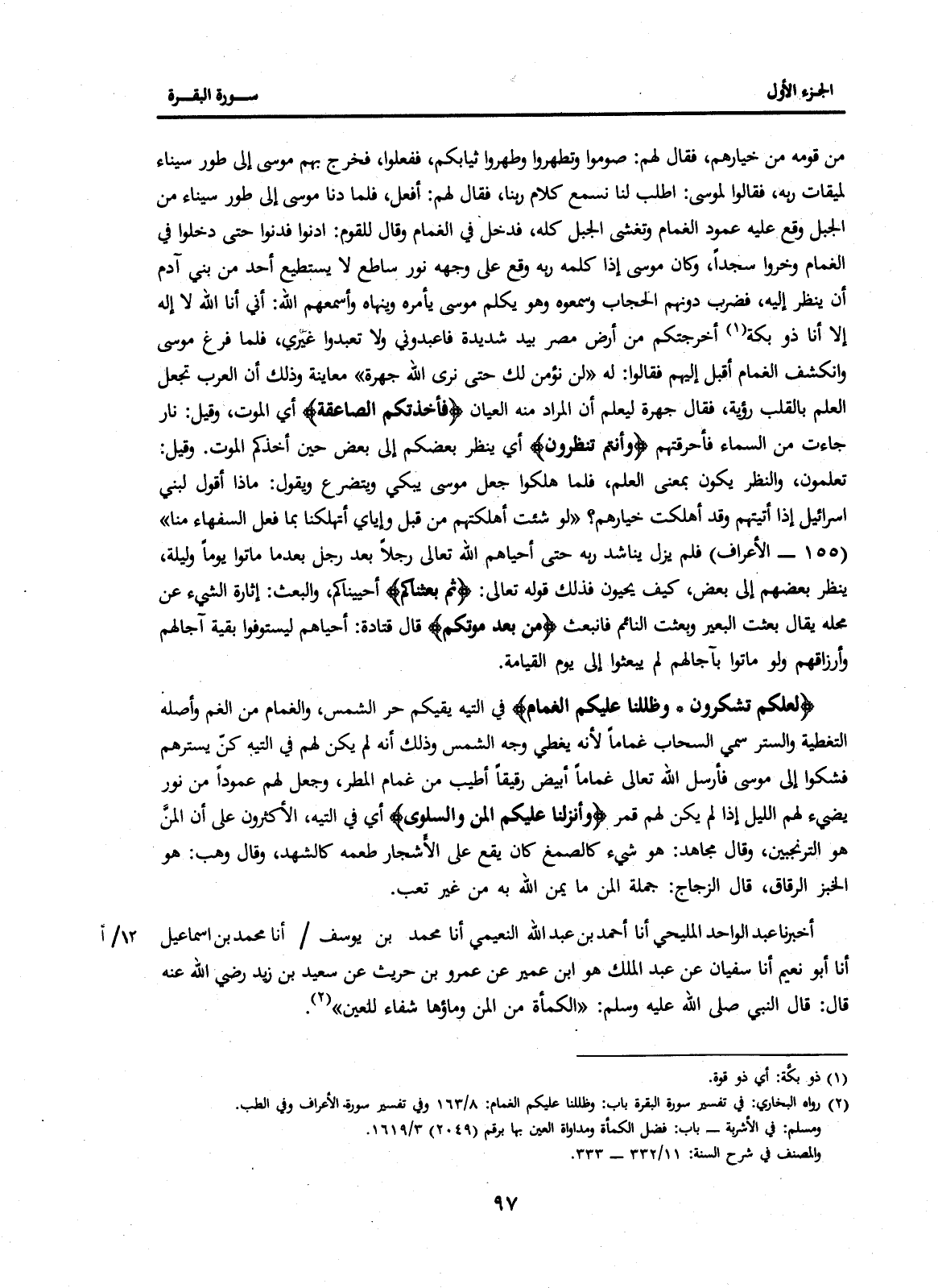 (2) رواه البخاري: في تفسير سورة البقرة باب: وظللنا عليكم الغمام: 8 / 163 وفي تفسير سورة الأعراف وفي الطب. ومسلم: في الأشربة - باب: فضل الكمأة ومداواة العين بها برقم (2049) 3 / 1619. والمصنف في شرح السنة: 11 / 332-333.