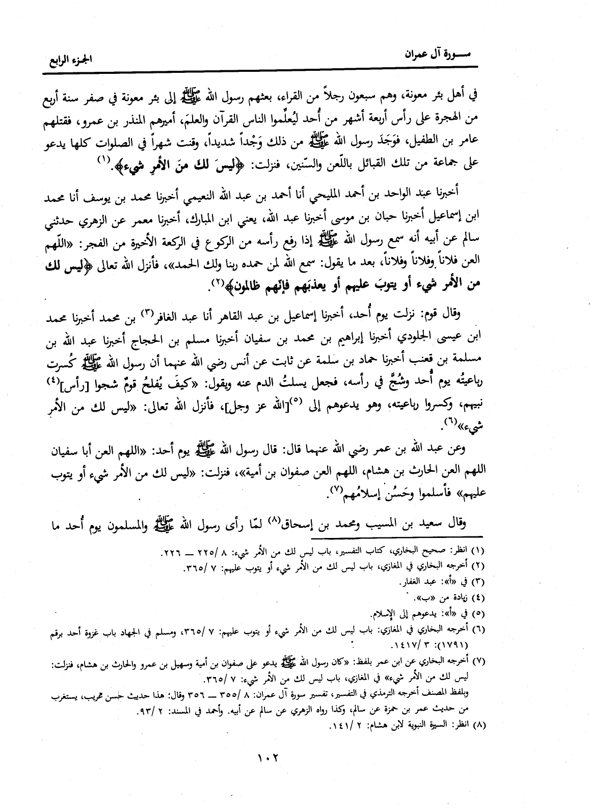 (1) انظر: صحيح البخاري كتاب التفسير باب ليس لك من الأمر شيء: 8 / 225 - 226.
