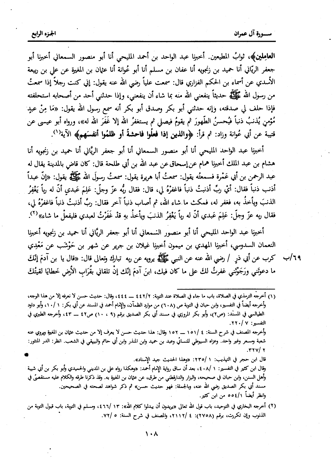 ثَوَابُ الْمُطِيعِينَ. أَخْبَرَنَا عَبْدُ الْوَاحِدِ بْنُ أَحْمَدَ الْمُلَيْحِيُّ، أَنَا أَبُو مَنْصُورٍ السَّمْعَانِيُّ، أَخْبَرَنَا أَبُو جَعْفَرٍ الرَّيَّانِيُّ، أَنَا حُمَيْدُ بْنُ زَنْجُوَيْهِ، أَنَا عَفَّانُ بْنُ مُسْلِمٍ، أَنَا أَبُو عُوَانَةَ، أَنَا عُثْمَانُ بْنُ الْمُغِيرَةِ عَنْ عَلِيِّ بْنِ رَبِيعَةَ الْأَسَدِيِّ، عَنْ أَسْمَاءَ بْنِ الْحَكَمِ الْفَزَارِيِّ، قَالَ: سَمِعْتُ عَلِيًّا رَضِيَ اللَّهُ عَنْهُ يَقُولُ: إِنِّي كُنْتُ رَجُلًا إِذَا سَمِعْتُ مِنْ رَسُولِ اللَّهِ صَلَّى اللَّهُ عَلَيْهِ وَسَلَّمَ حَدِيثًا يَنْفَعُنِي اللَّهُ مِنْهُ بِمَا شَاءَ أَنْ يَنْفَعَنِي وَإِذَا حَدَّثَنِي أَحَدٌ مِنْ أَصْحَابِهِ اسْتَحْلَفْتُهُ فَإِذَا حَلَفَ لِي صَدَّقْتُهُ، وَإِنَّهُ حَدَّثَنِي أَبُو بَكْرٍ وَصَدَقَ أَبُو بَكْرٍ أَنَّهُ سَمِعَ رَسُولَ اللَّهِ يَقُولُ: "مَا مِنْ عَبْدٍ مُؤْمِنٍ يُذْنِبُ ذَنْبًا فَيُحْسِنُ الطَّهُورَ ثُمَّ يَقُومُ فَيُصَلِّي ثُمَّ يَسْتَغْفِرُ اللَّهَ إِلَّا غَفَرَ اللَّهُ لَهُ" وَرَوَاهُ أَبُو عِيسَى عَنْ قُتَيْبَةَ عَنْ أَبِي عَوَانَةَ وَزَادَ: ثُمَّ قَرَأَ: {وَالَّذِينَ إِذَا فَعَلُوا فَاحِشَةً أَوْ ظَلَمُوا أَنْفُسَهُمْ} الْآيَةَ (1) .