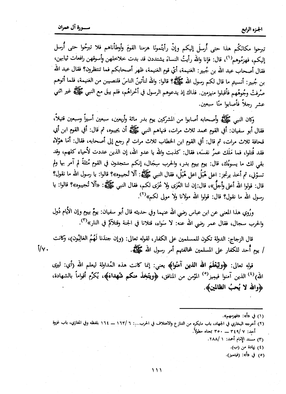 (2) أخرجه البخاري في الجهاد باب ما يكره من التنازع والاختلاف في الحرب. . . 6 / 163 - 164 بلفظه وفي المغازي باب غزوة أحد: 7 / 349 - 350 بمعناه مطولا.
