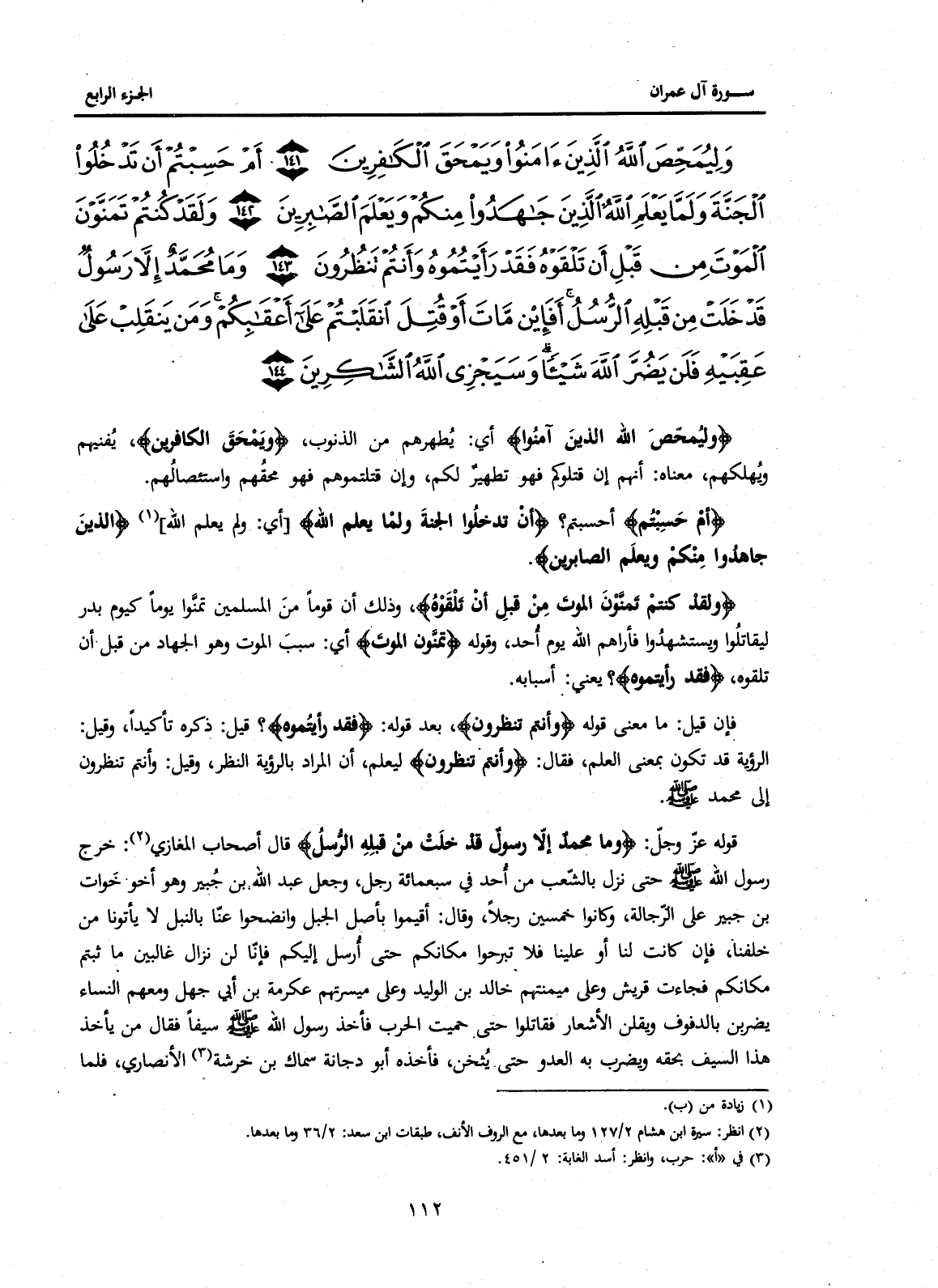 قَوْلُهُ عَزَّ وَجَلَّ: {وَمَا مُحَمَّدٌ إِلَّا رَسُولٌ قَدْ خَلَتْ مِنْ قَبْلِهِ الرُّسُلُ} قَالَ أَصْحَابُ الْمُغَازِي (2) خَرَجَ رَسُولُ اللَّهِ صَلَّى اللَّهُ عَلَيْهِ وَسَلَّمَ حَتَّى نَزَلَ بِالشِّعْبِ مِنْ أُحُدٍ فِي سَبْعِمِائَةِ رَجُلٍ، وَجَعَلَ عَبْدُ اللَّهِ بْنُ جُبَيْرٍ وَهُوَ أَخُو خَوَّاتِ بْنِ جُبَيْرٍ عَلَى الرَّجَّالَةِ وَكَانُوا خَمْسِينَ رَجُلًا وَقَالَ: أَقِيمُوا بِأَصْلِ الْجَبَلِ وَانْضَحُوا عَنَّا بِالنَّبْلِ لَا يَأْتُونَا مِنْ خَلْفِنَا، فَإِنْ كَانَتْ لَنَا أَوْ عَلَيْنَا فَلَا تَبْرَحُوا مَكَانَكُمْ حَتَّى أُرْسِلَ إِلَيْكُمْ فَإِنَّا لَنْ نَزَالَ غَالِبِينَ مَا ثَبَتُّمْ مَكَانَكُمْ فَجَاءَتْ قُرَيْشٌ وَعَلَى مَيْمَنَتِهِمْ خَالِدُ بْنُ الْوَلِيدِ وَعَلَى مَيْسَرَتِهِمْ عِكْرِمَةُ بْنُ أَبِي جَهْلٍ وَمَعَهُمُ النِّسَاءُ يَضْرِبْنَ بِالدُّفُوفِ وَيَقُلْنَ الْأَشْعَارَ فَقَاتَلُوا حَتَّى حَمِيَتِ الْحَرْبُ فَأَخَذَ رَسُولُ اللَّهِ صَلَّى اللَّهُ عَلَيْهِ وَسَلَّمَ سَيْفًا فَقَالَ مَنْ يَأْخُذُ هَذَا السَّيْفَ بِحَقِّهِ وَيَضْرِبُ بِهِ الْعَدُوَّ حَتَّى يُثْخِنَ، فَأَخَذَهُ أَبُو دُجَانَةَ سِمَاكُ بْنُ خَرَشَةَ (3) الْأَنْصَارِيُّ فَلَمَّا