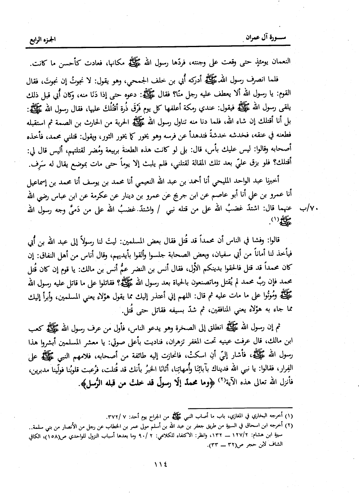 قَالُوا: وَفَشَا فِي النَّاسِ أَنَّ مُحَمَّدًا قَدْ قُتِلَ فَقَالَ بَعْضُ الْمُسْلِمِينَ: لَيْتَ لَنَا رَسُولًا إِلَى عَبْدِ اللَّهِ بْنِ أُبَيٍّ فَيَأْخُذُ لَنَا أَمَانًا مِنْ أَبِي سُفْيَانَ، وَبَعْضُ الصَّحَابَةِ جَلَسُوا وَأَلْقَوْا بِأَيْدِيهِمْ، وَقَالَ أُنَاسٌ مِنْ أَهْلِ النِّفَاقِ: إِنْ كَانَ مُحَمَّدًا قَدْ قُتِلَ فَالْحَقُوا بِدِينِكُمُ الْأَوَّلِ، فَقَالَ أَنَسُ بْنُ النَّضْرِ عَمُّ أَنَسِ بْنِ مَالِكٍ: يَا قَوْمُ إِنْ كَانَ قُتِلَ مُحَمَّدٌ فَإِنَّ رَبَّ مُحَمَّدٍ لَمْ يُقْتَلْ وَمَا تَصْنَعُونَ بِالْحَيَاةِ بَعْدَ رَسُولِ اللَّهِ صَلَّى اللَّهُ عَلَيْهِ وَسَلَّمَ؟ فَقَاتِلُوا عَلَى مَا قَاتَلَ عَلَيْهِ رَسُولُ اللَّهِ صَلَّى اللَّهُ عَلَيْهِ وَسَلَّمَ وَمُوتُوا عَلَى مَا مَاتَ عَلَيْهِ ثُمَّ قَالَ: اللَّهُمَّ إِنِّي أَعْتَذِرُ إِلَيْكَ مِمَّا يَقُولُ هَؤُلَاءِ يَعْنِي الْمُسْلِمِينَ، وَأَبْرَأُ إِلَيْكَ مِمَّا جَاءَ بِهِ هَؤُلَاءِ يَعْنِي الْمُنَافِقِينَ، ثُمَّ شَدَّ بِسَيْفِهِ فَقَاتَلَ حَتَّى قُتِلَ.