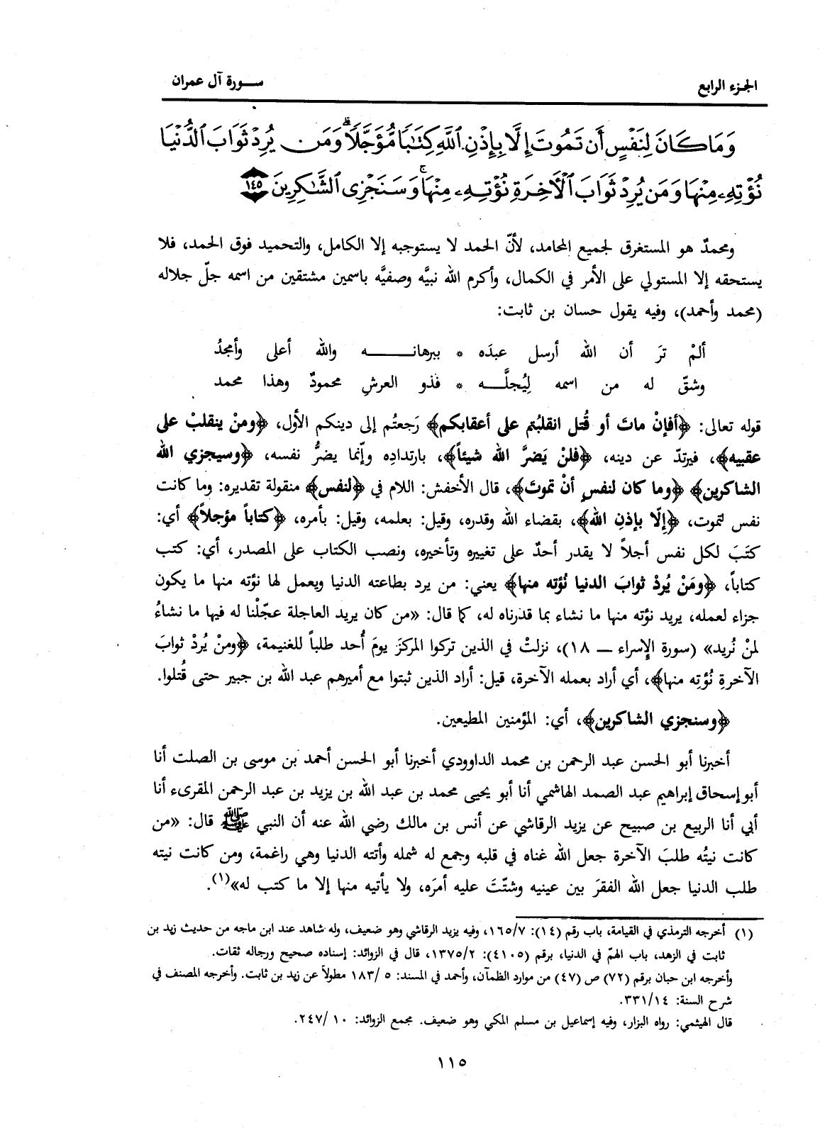 {وَمَا كَانَ لِنَفْسٍ أَنْ تَمُوتَ إِلَّا بِإِذْنِ اللَّهِ كِتَابًا مُؤَجَّلًا وَمَنْ يُرِدْ ثَوَابَ الدُّنْيَا نُؤْتِهِ مِنْهَا وَمَنْ يُرِدْ ثَوَابَ الْآخِرَةِ نُؤْتِهِ مِنْهَا وَسَنَجْزِي الشَّاكِرِينَ (145) }