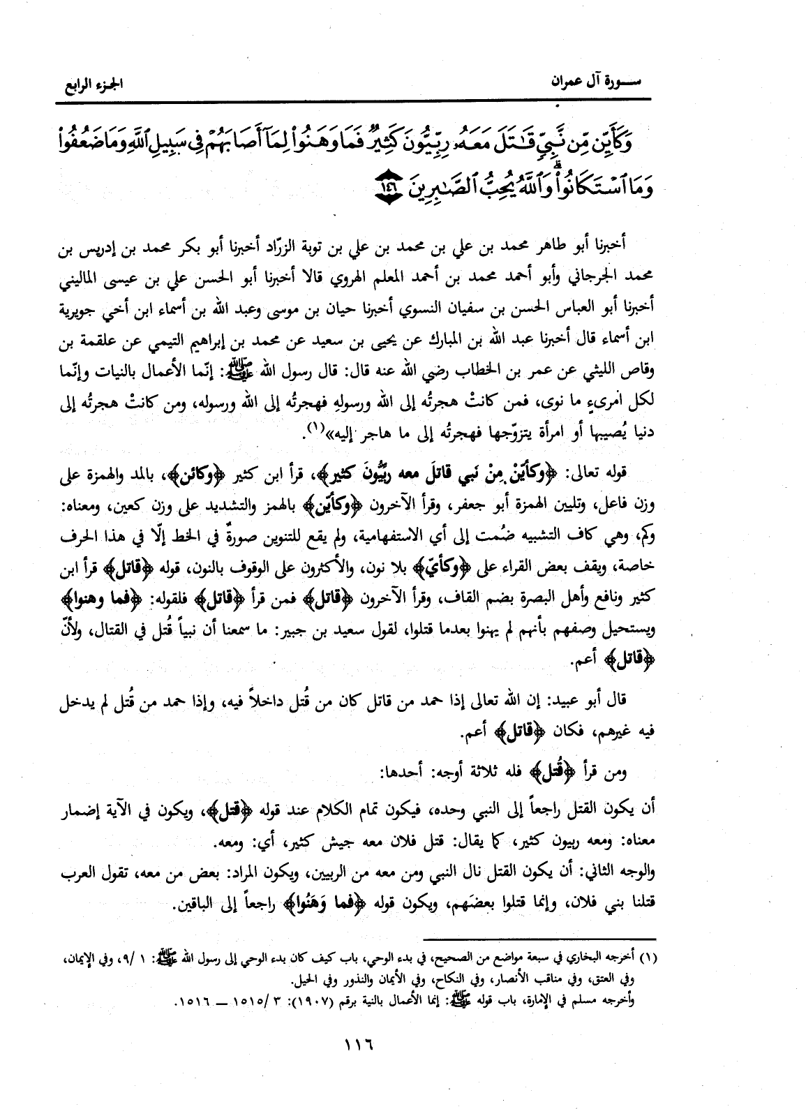 قَوْلُهُ تَعَالَى: {وَكَأَيِّنْ مِنْ نَبِيٍّ قَاتَلَ مَعَهُ رِبِّيُّونَ كَثِيرٌ} قَرَأَ ابْنُ كَثِيرٍ " وَكَائِنٌ " بِالْمَدِّ وَالْهَمْزَةِ عَلَى وَزْنِ فَاعِلٍ وَتَلْيِينُ الْهَمْزَةِ أَبُو جَعْفَرٍ، وَقَرَأَ الْآخَرُونَ " وَكَأَيِّنْ " بِالْهَمْزِ وَالتَّشْدِيدِ عَلَى وَزْنٍ كَعَيِّنْ، وَمَعْنَاهُ: وَكَمْ، وَهِيَ كَافُ التَّشْبِيهِ ضُمَّتْ إِلَى أَيٍّ الِاسْتِفْهَامِيَّةِ، وَلَمْ يَقَعْ لِلتَّنْوِينِ صُورَةٌ فِي الْخَطِّ إِلَّا فِي هَذَا الْحَرْفِ خَاصَّةً وَيَقِفُ بَعْضُ الْقُرَّاءِ عَلَى " وَكَأَيٍّ " بِلَا نُونٍ وَالْأَكْثَرُونَ عَلَى الْوُقُوفِ بِالنُّونِ قَوْلُهُ {قَاتَلَ} قَرَأَ ابْنُ كَثِيرٍ وَنَافِعٌ وَأَهْلُ الْبَصْرَةِ بِضَمِّ الْقَافِ وَقَرَأَ الْآخَرُونَ {قَاتَلَ} فَمَنْ قَرَأَ {قَاتَلَ} فَلِقَوْلِهِ: {فَمَا وَهَنُوا} وَيَسْتَحِيلُ وَصْفُهُمْ بِأَنَّهُمْ لَمْ يَهِنُوا بَعْدَمَا قُتِلُوا لِقَوْلِ سَعِيدِ بْنِ جُبَيْرٍ: مَا سَمِعْنَا أَنَّ نَبِيًّا قُتِلَ فِي الْقِتَالِ وَلِأَنَّ {قَاتَلَ} أَعَمُّ.