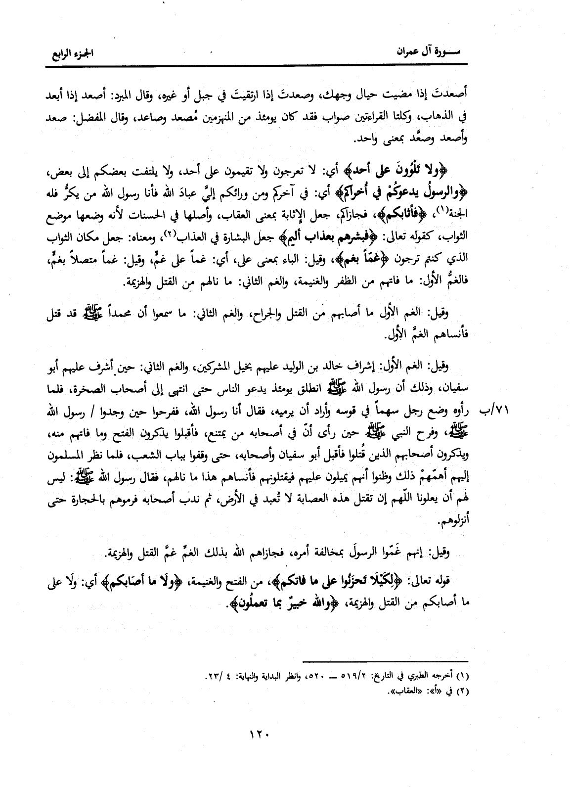 {وَلَا تَلْوُونَ عَلَى أَحَدٍ} أَيْ: لَا تَعْرُجُونَ وَلَا تُقِيمُونَ عَلَى أَحَدٍ وَلَا يَلْتَفِتُ بَعْضُكُمْ إِلَى بَعْضٍ، {وَالرَّسُولُ يَدْعُوكُمْ فِي أُخْرَاكُمْ} أَيْ: فِي آخِرِكُمْ وَمِنْ وَرَائِكُمْ إِلَيَّ عِبَادَ اللَّهِ فَأَنَا رَسُولُ اللَّهِ مَنْ يَكِرُّ فَلَهُ الْجَنَّةُ (1) ، {فَأَثَابَكُمْ} فَجَازَاكُمْ جَعَلَ الْإِثَابَةَ بِمَعْنَى الْعِقَابِ، وَأَصْلُهَا فِي الْحَسَنَاتِ لِأَنَّهُ وَضَعَهَا مَوْضِعَ الثَّوَابِ كَقَوْلِهِ تَعَالَى: {فَبَشِّرْهُمْ بِعَذَابٍ أَلِيمٍ} جَعَلَ الْبِشَارَةَ فِي الْعَذَابِ (2) وَمَعْنَاهُ: جَعَلَ مَكَانَ الثَّوَابِ الَّذِي كُنْتُمْ تَرْجُونَ (3) {غَمًّا بِغَمٍّ} وَقِيلَ: الْبَاءُ بِمَعْنَى عَلَى أَيْ: غَمًّا عَلَى غَمٍّ وَقِيلَ: غَمَّا مُتَّصِلًا بِغَمٍّ فَالْغَمُّ الْأَوَّلُ: مَا فَاتَهُمْ مِنَ الظَّفَرِ وَالْغَنِيمَةِ، وَالْغَمُّ الثَّانِي: مَا نَالَهُمْ مِنَ الْقَتْلِ وَالْهَزِيمَةِ.